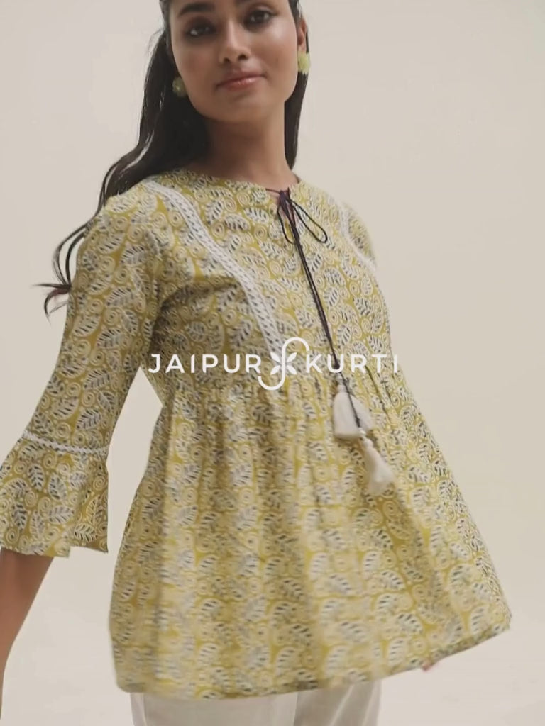 Mustard Printed Cotton Gathered Top has a round neck with drawstrings, bell sleeves and gathered details.