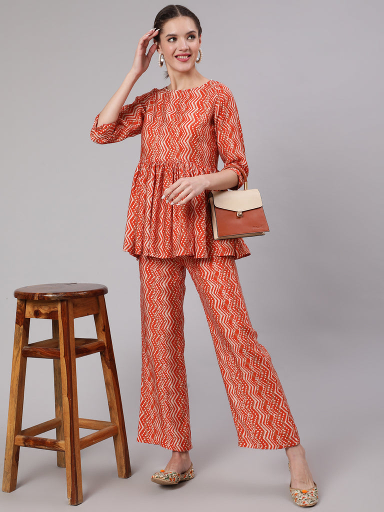 Orange Muslin Zigzag Print Gathered Top, Round Neck, Three-Quarter Sleeve with Cuff Detailing Paired with Printed Orange Muslin Palazzo has slip on closure has Partial Elastic with two pockets.