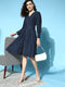 Women Self Weave Rayon Dress Has V Neckline With Front Opening Has Loops And Buttons, Puffed Three Fourth Sleeves Has Cuff With Buttons, Zipper At The Side Seam, Gathers At The Waistline, Flared Hem