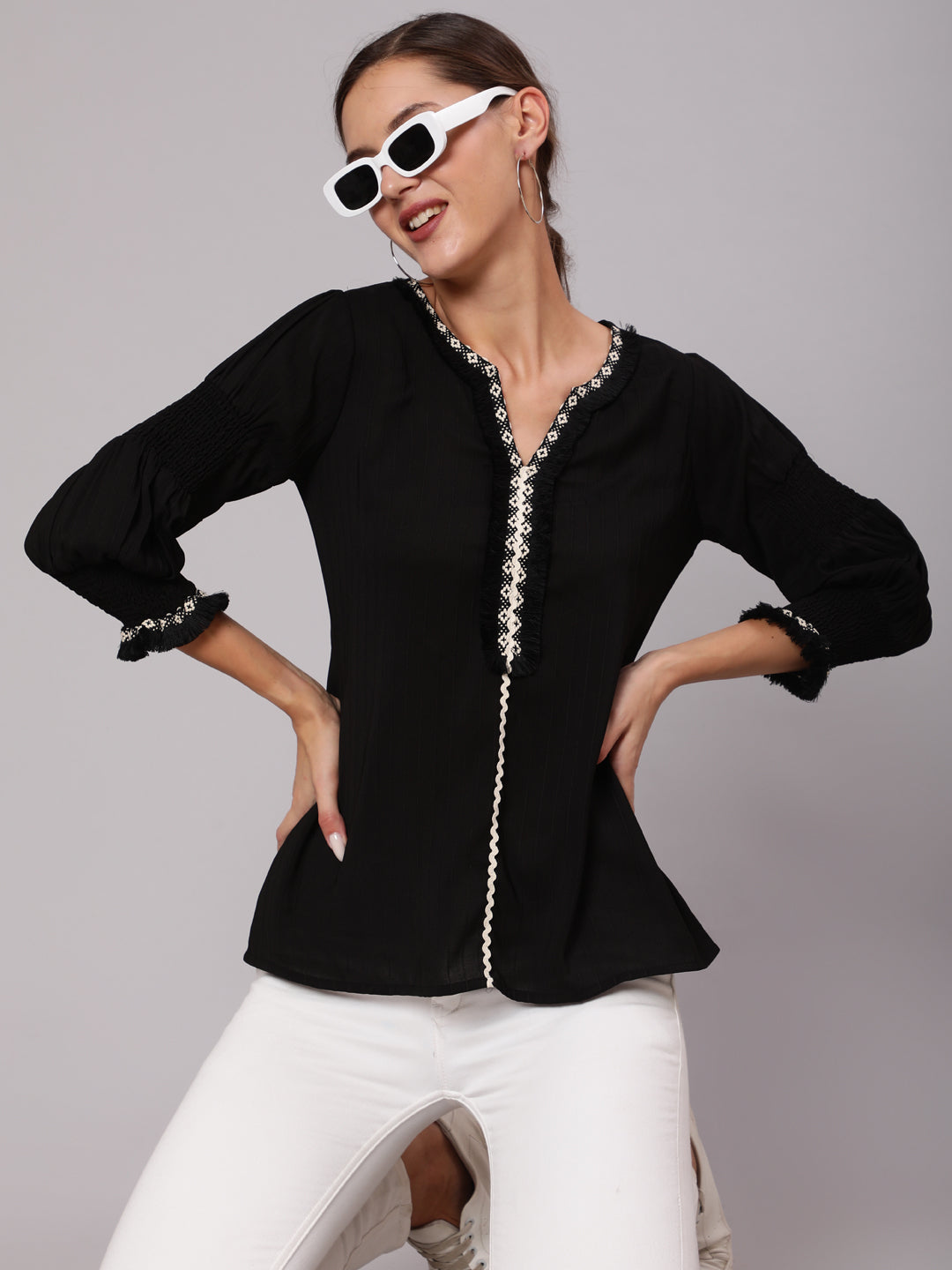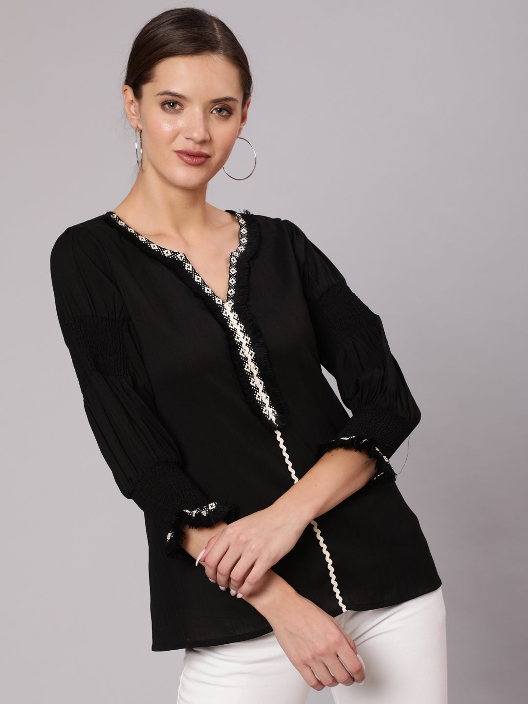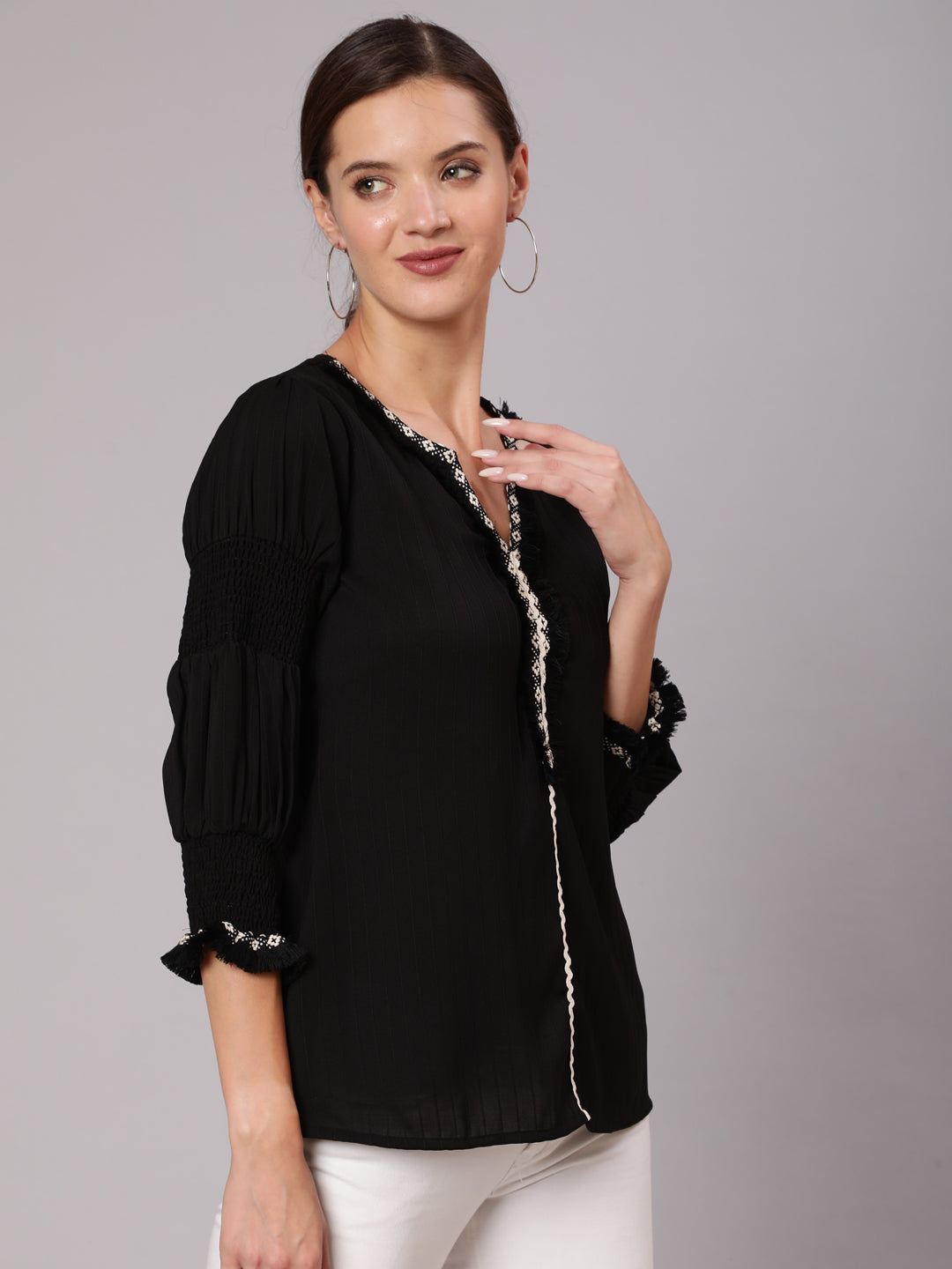 A Black Poly Silk Top With Lace Embellishments, Rounded V-Neck, Three-Fourth Sleeves With Smocking At The Cuff Part, Has A Flared Hem