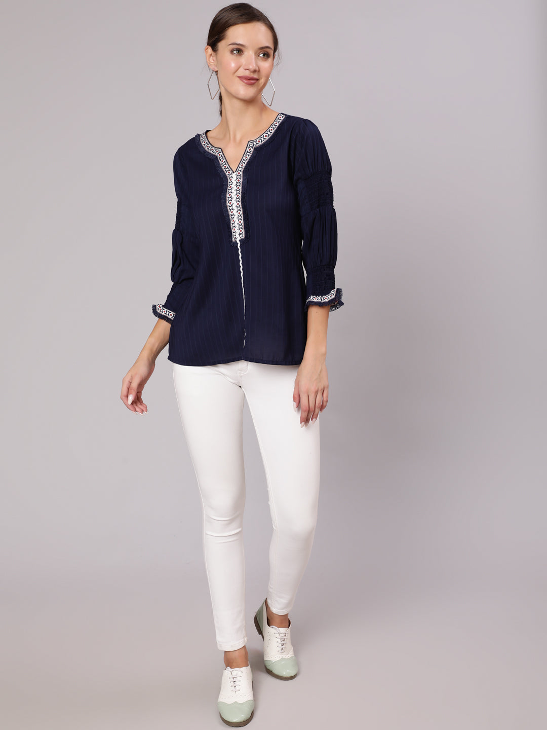 A Blue Poly Silk Lace Embellished Top With Smocked Sleeves