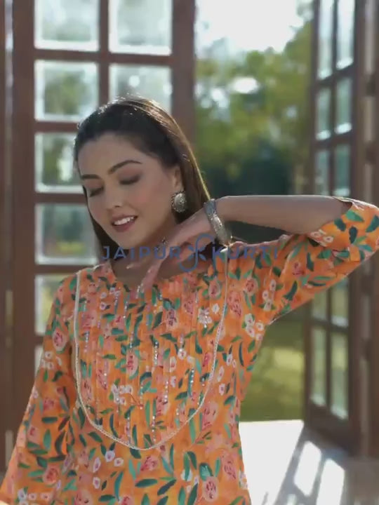 A Orange Color Floral Digital Print Poly Slub Kurta With Three-Fourth Regular Sleeves, Pintucks In The Yoke With Lace Detailings, Has Side Slits, Round Neck With A Straight Hem, Off White Cotton Regular Fit Pants Has Both Side Pocket And Partially Elastic At Waist