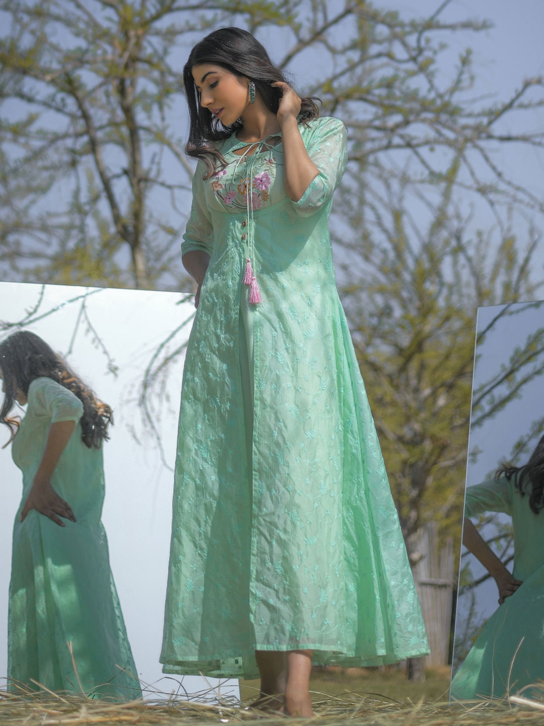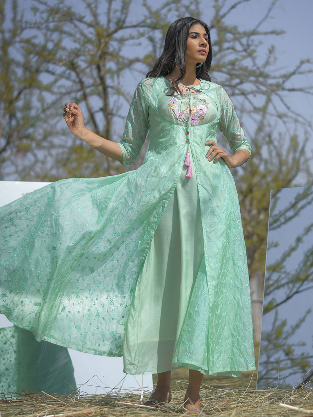An amazing range of designer Kurta with Inner by AMAIVA. Green Silk Ethnic Motifs a line embroidered solid inner with a line embroidered kota doriya shrug, dori tassel detail.
