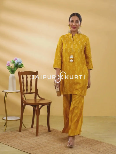 This Bandhani Printed Dola Silk Mustard Co-ord Set comes with a short kurta and palazzo. The kurta has a mandarin collar, kantha and sequin work, three-quarter sleeves and a front placket. The palazzo is partially elasticated and has side pockets.