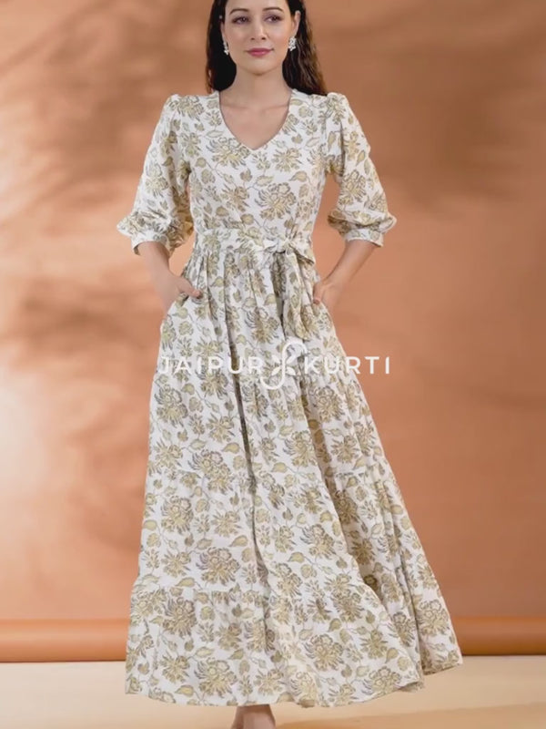 Beige Floral Printed Tier Cotton Dress