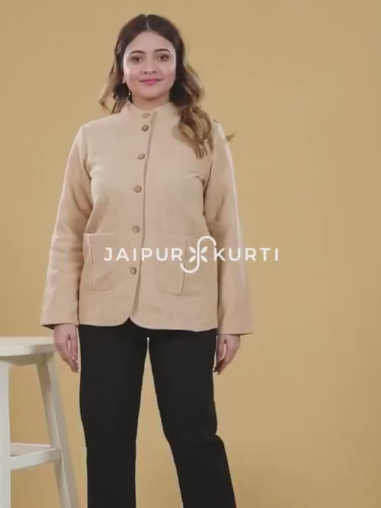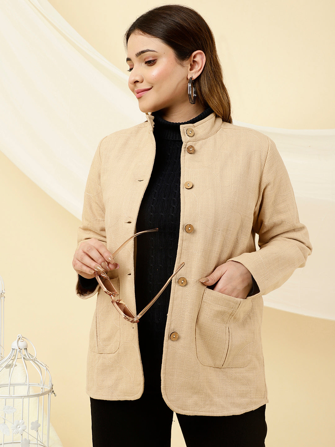 A perfect amalgamation of comfort and sophistication, this Beige Quilted Jacket is a classic wardrobe staple. It has front buttons, a mandarin collar neck and front pockets that help showcase a stunning look.