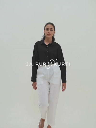 Flaunt a chic yet classic vibe in this Black Cotton Cambric Full Sleeves Shirt. It has cuffed sleeves and a front button placket.