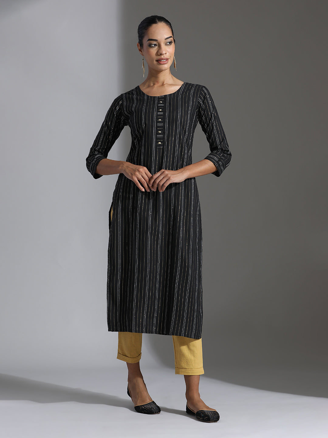 A wardrobe essential, this Black Embellished Polycotton Straight Kurta has a round neck, three-quarter sleeves, a front placket and sequin work details.