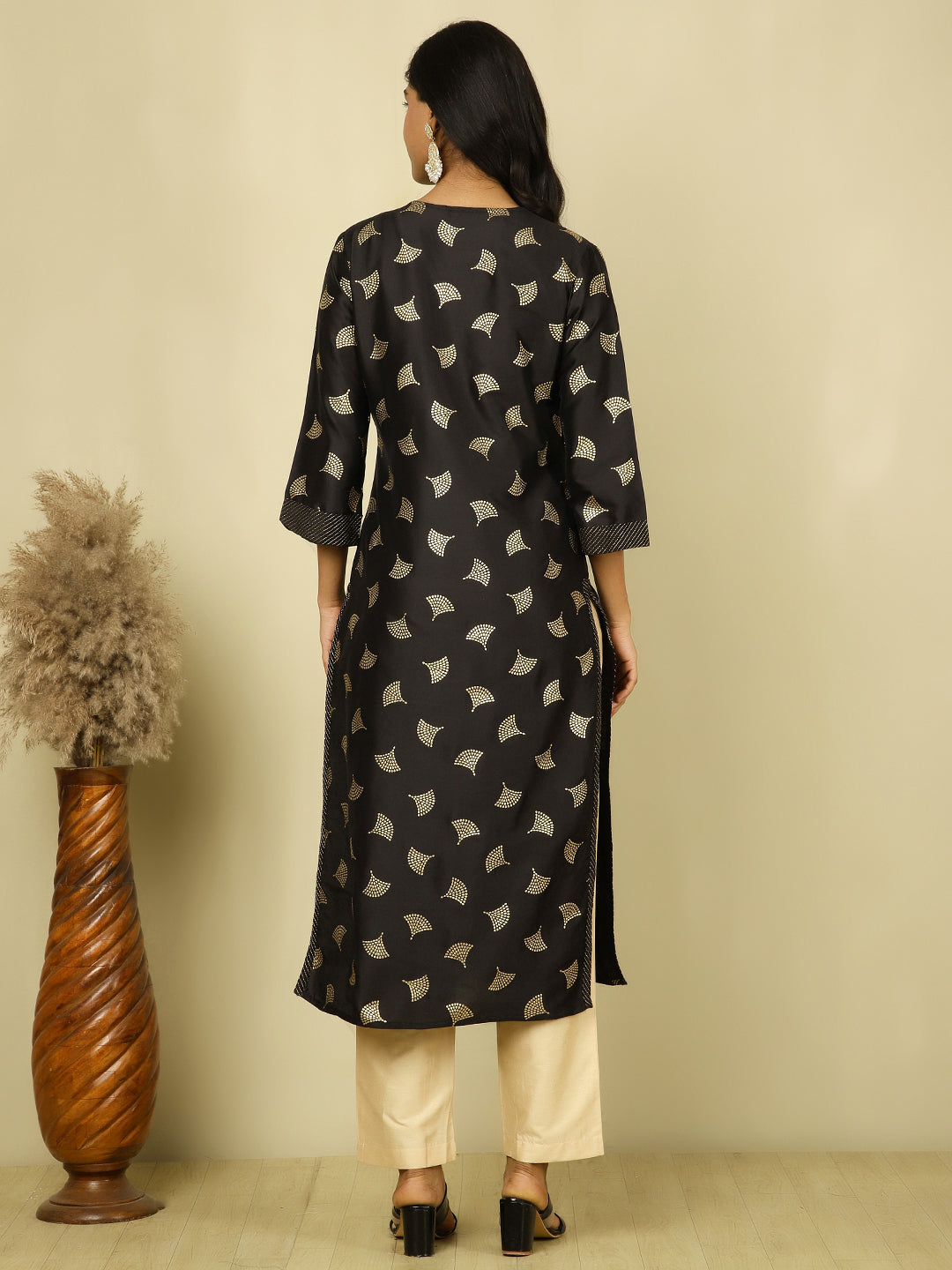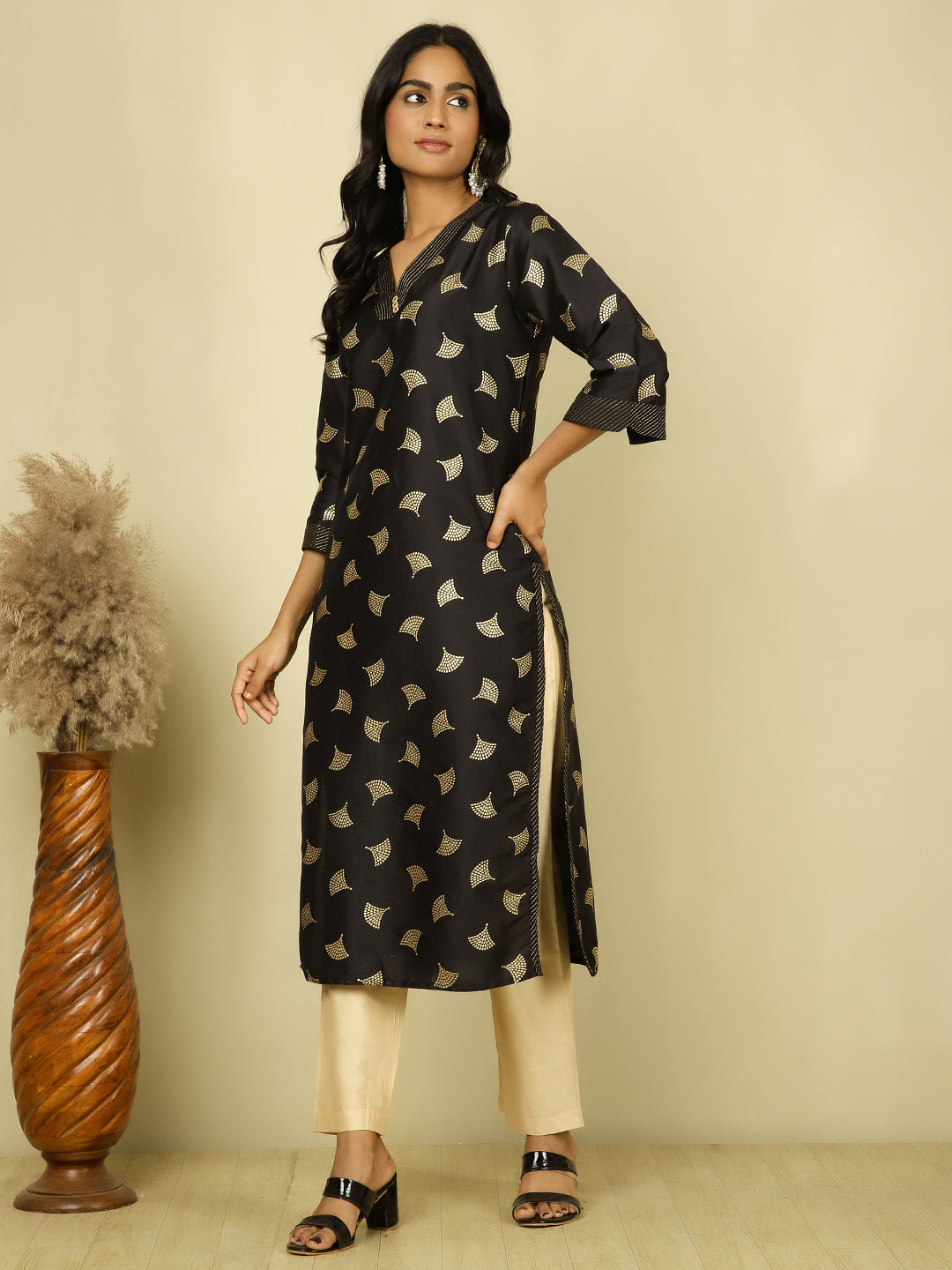 A festive must-have, this Black Ethnic Printed Straight Kurta has a v-neckline and three-quarter cuff sleeves.