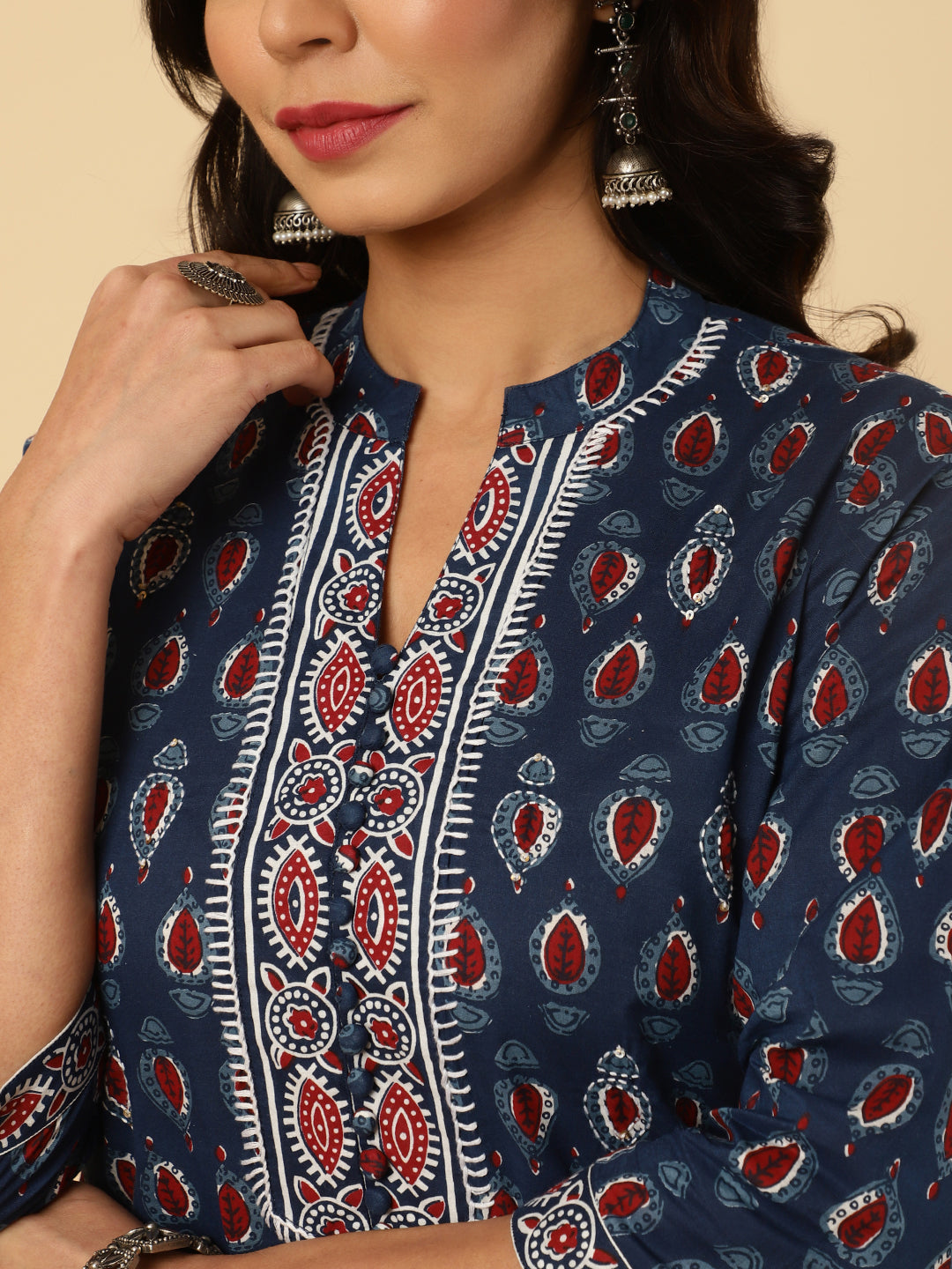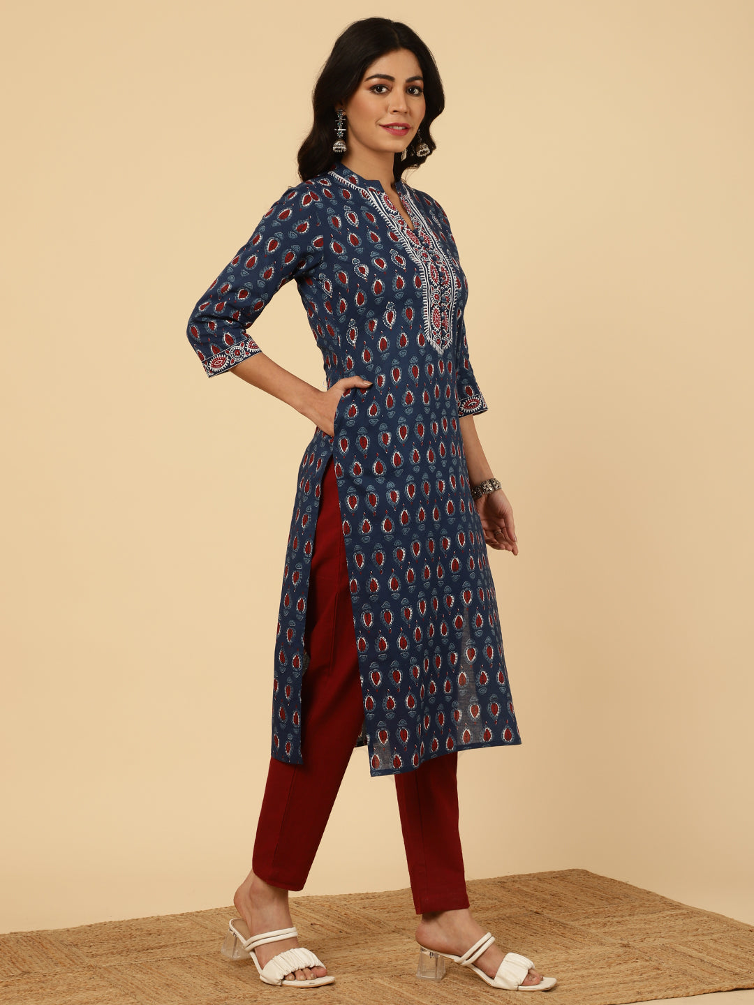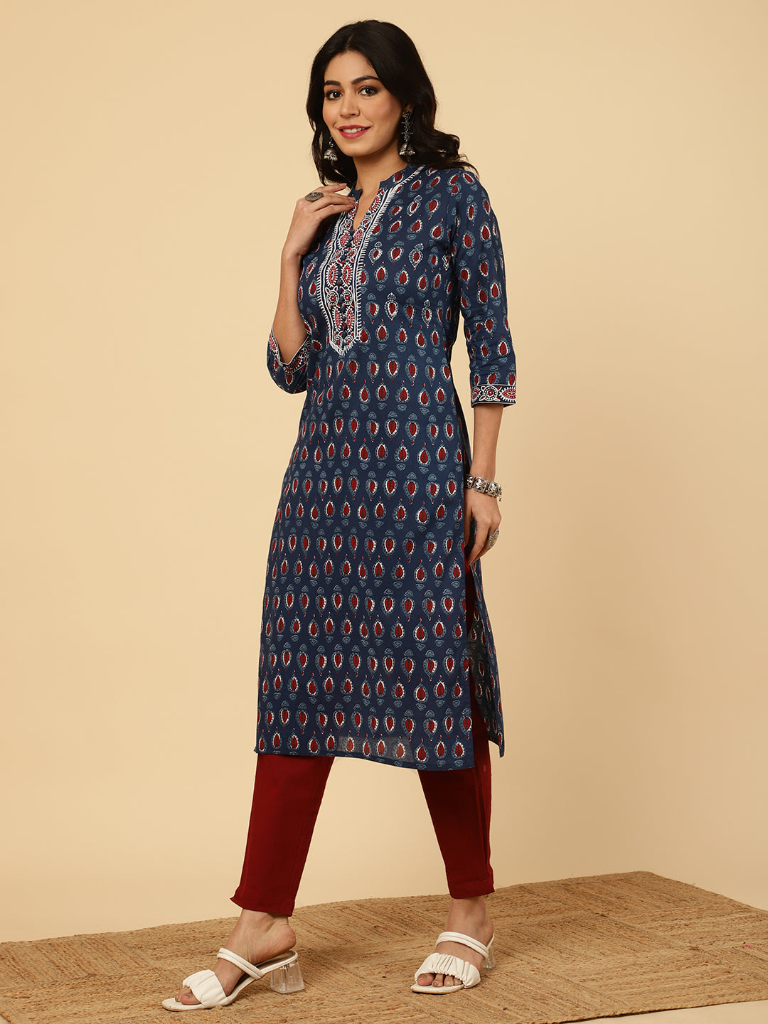 Radiate vibrant vibes in this Blue Embroidered Ethnic Printed Straight Cotton Kurta. It has a mandarin collar, three-quarter sleeves, front potli button placket and embroidered details.