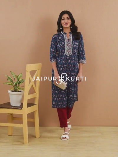 Blue Embroidered Ethnic Printed Straight Cotton Kurta