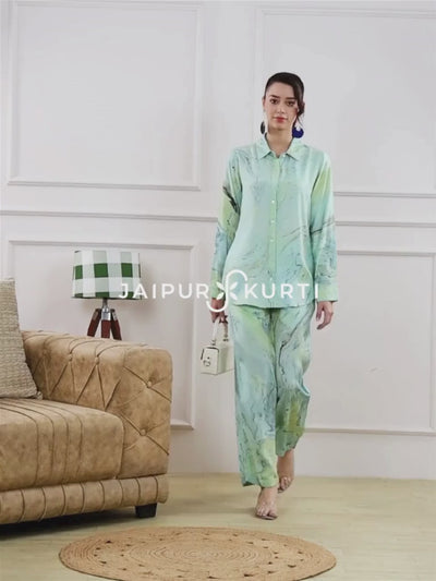 Blue Hand block placement with Marble dyeing Co-ord Set has a shirt with full sleeves, a shirt collar and a front button placket paired with a partially elasticated palazzo.
