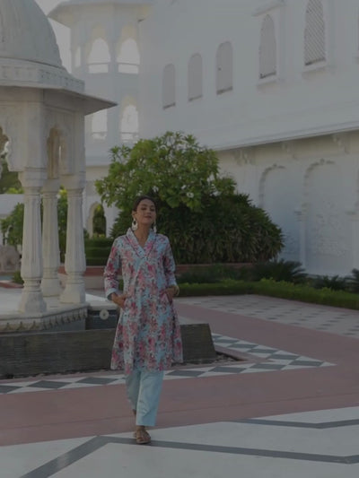 Blue Velvet Aline Kurta Printed And Embroidered Kurta Has Front Embroidered ,V Neck, With Collar Neck ,Three-Quarter Sleeve Paird With Solid Velvet Pant Has Partial Elasticated Pant Slip On Closure