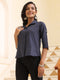 Blue Yarn Dyed Stripes Shirt Has Spread Collar With Front Hidden Placket And Buttons For Opening, Elbow Regular Sleeves, Cured Shape With High- Low Top Hemline.