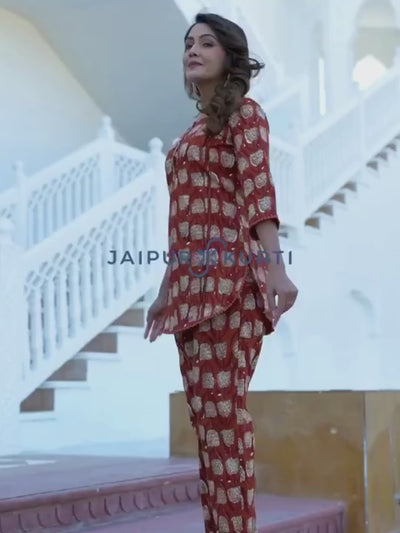 Brown cotton printed top has round neck with placket and buttons for opening, three fourth regular sleeves has crochet lace at hemline, curved hemline with crochet lace at edges, regular fit cotton printed pants has both side pocket and has partially elasticated at waist