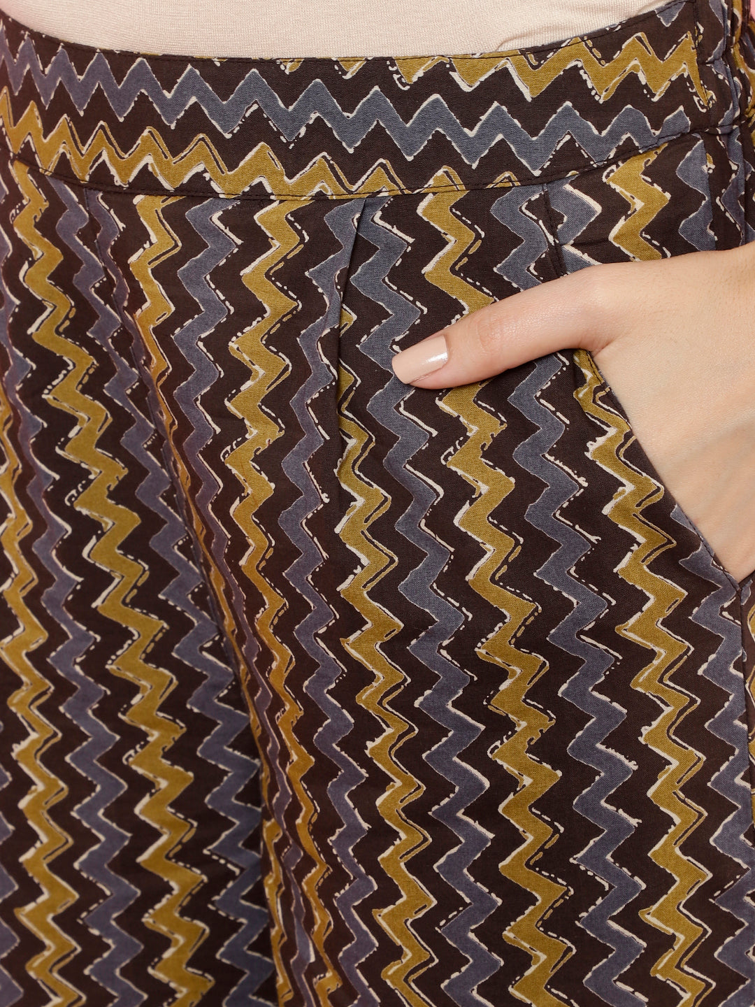 Stay stylish and comfortable in this Charcoal Grey Ethnic Printed Straight Kurta With Pants. Crafted in cotton cambric fabric, this Straight Mix Match Printed Kurta has a mandarin collar, half sleeves, front panel with tassels and button embellishment. Paired with zig-zag printed partially elasticated pants.