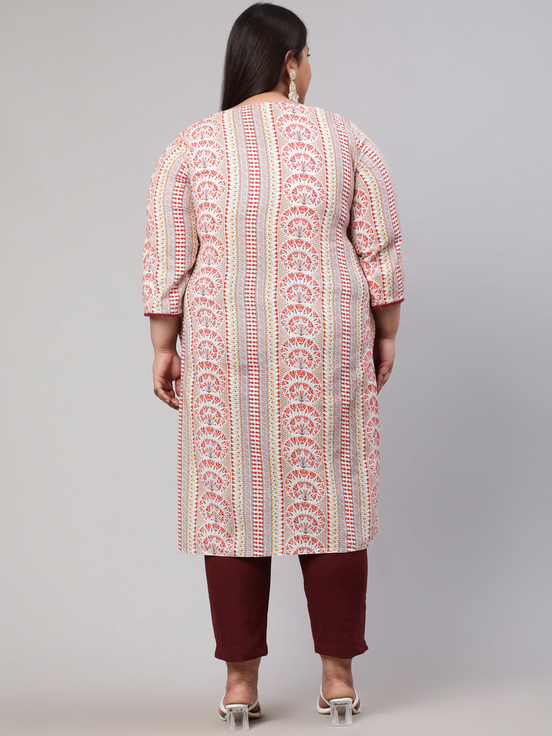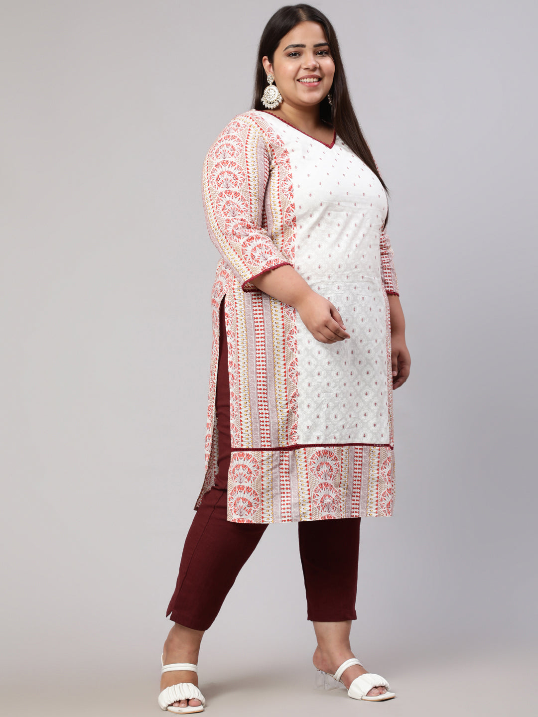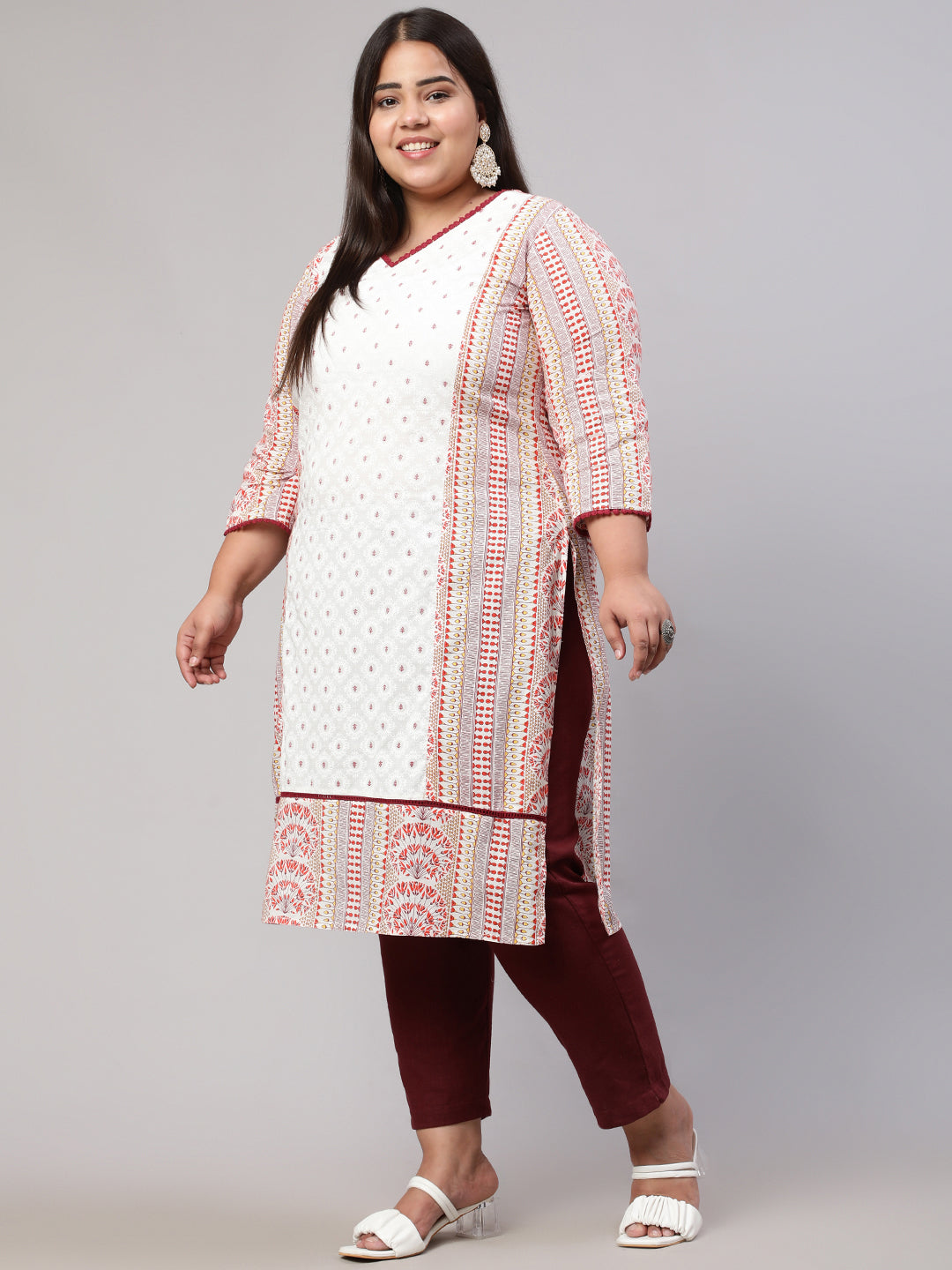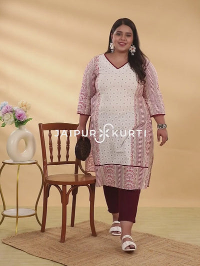 Plus Size White and Maroon Ethnic Printed Straight Kurta