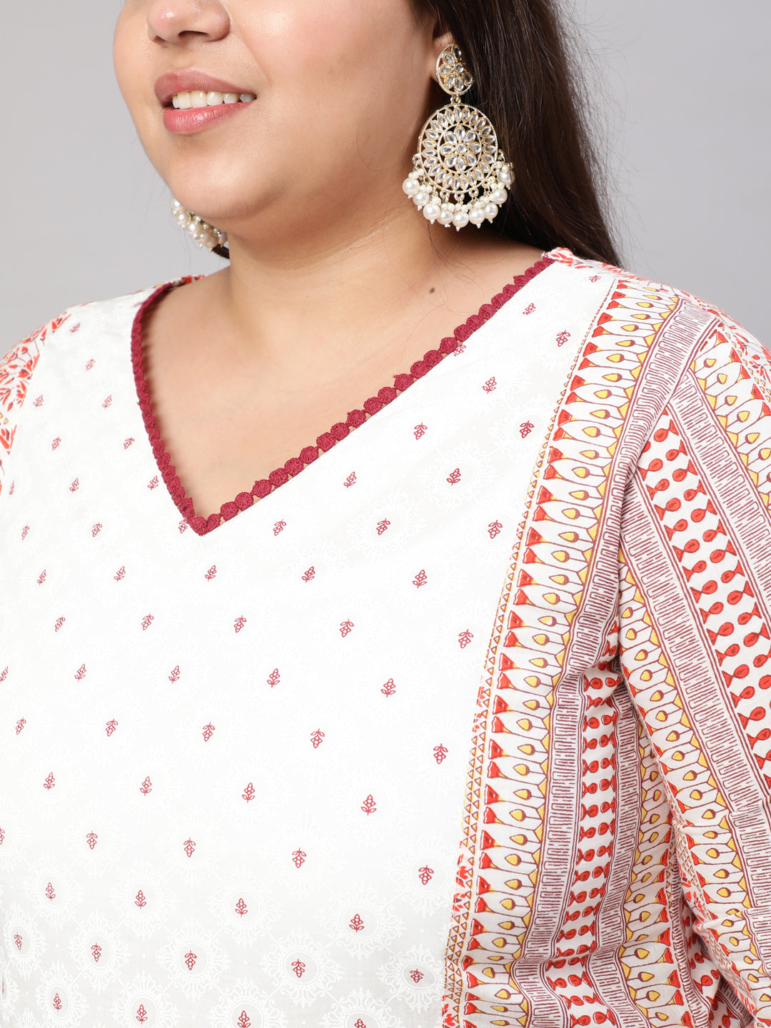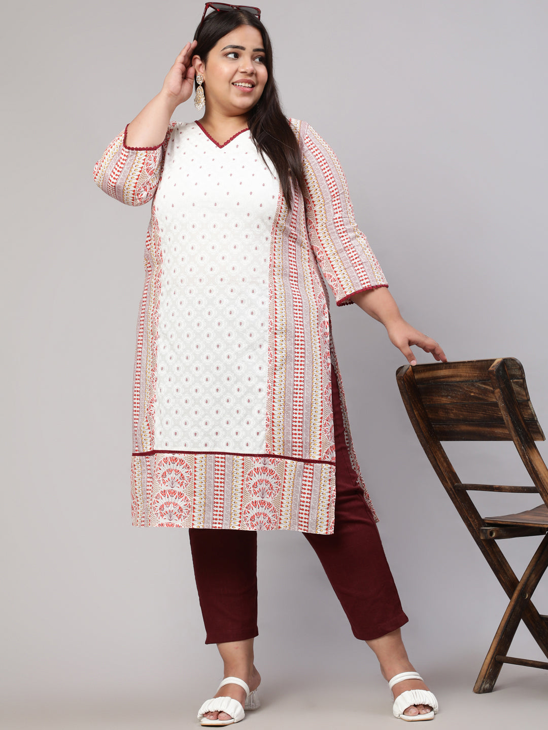 This Plus Size White and Maroon Ethnic Printed Straight Kurta is made of cotton cambric fabric and features a v-neckline, contrasting blue lace, and three-quarter sleeves. Pair it with dark-colored contrasting pants to complete the look.