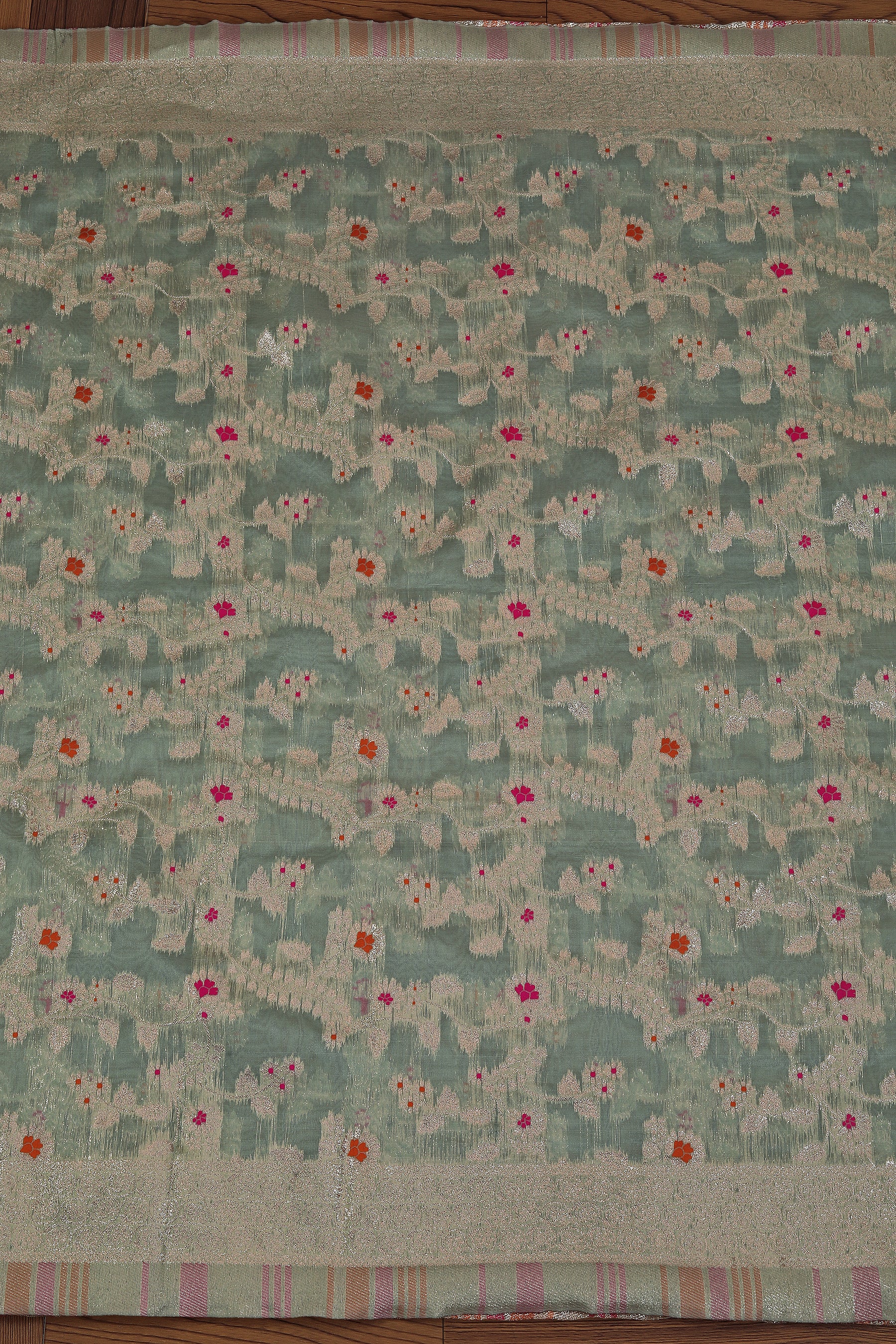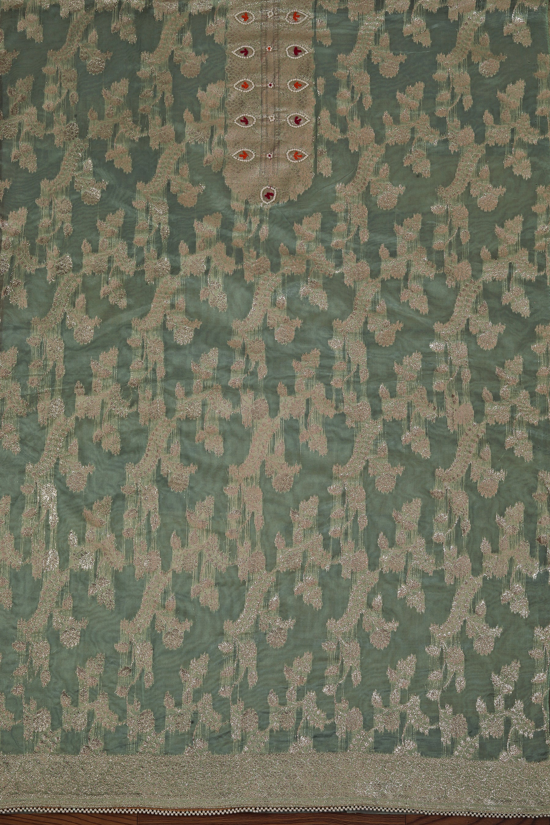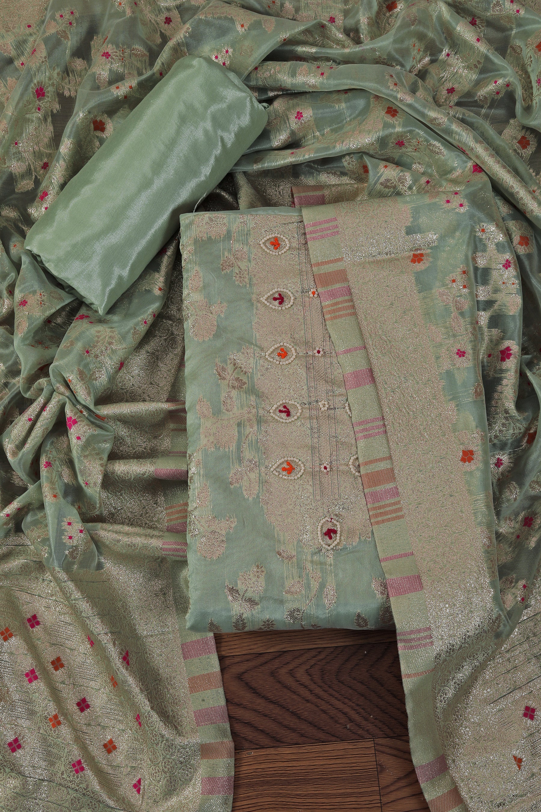 This Green Embellished Zari Woven Dress Material with Dupatta is a charming style. The kurta has silk blend fabric with bead and stone work. It comes with matching pants and an embroidered dupatta.