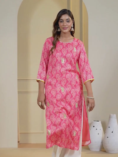 Featuring a festive season's style! Crafted in art silk fabric, this peach straight kurta features traditional paisley printed, a round neckline, three-quarter sleeves, placement zari embroidery and lace details