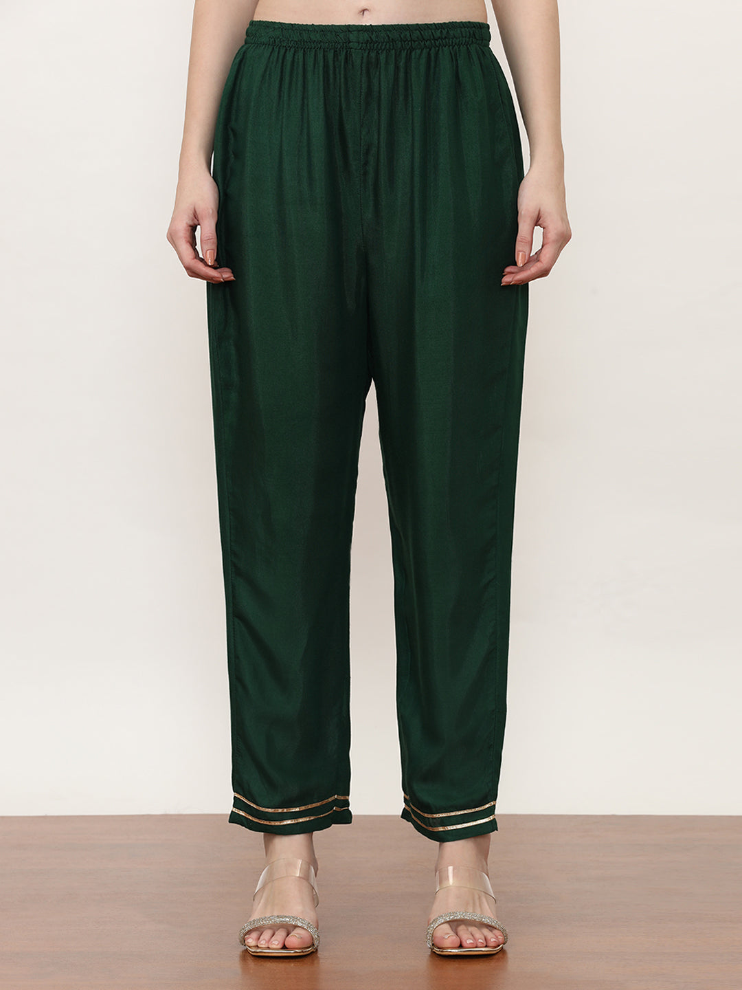 Embrace a comforting style with this Floral Embroidered Cotton Blend Green Kurta Sets. This Straight Kurta For Women has a Round Neck, Three-Quarter Sleeves With Zari. Paired With a Trousers.