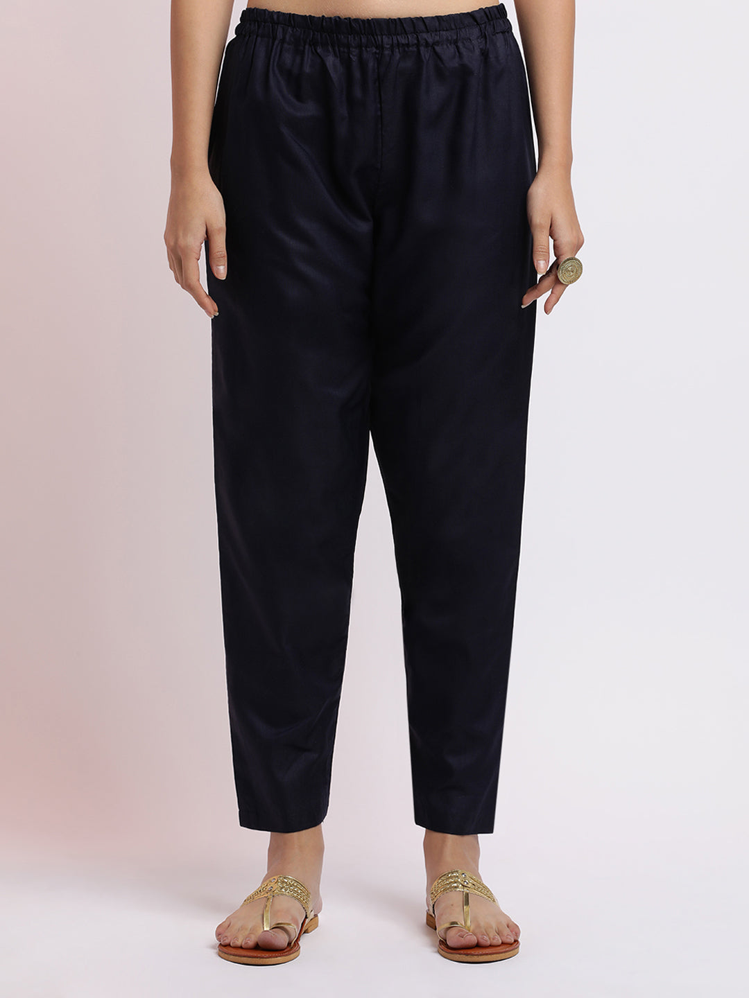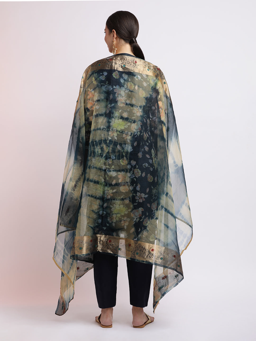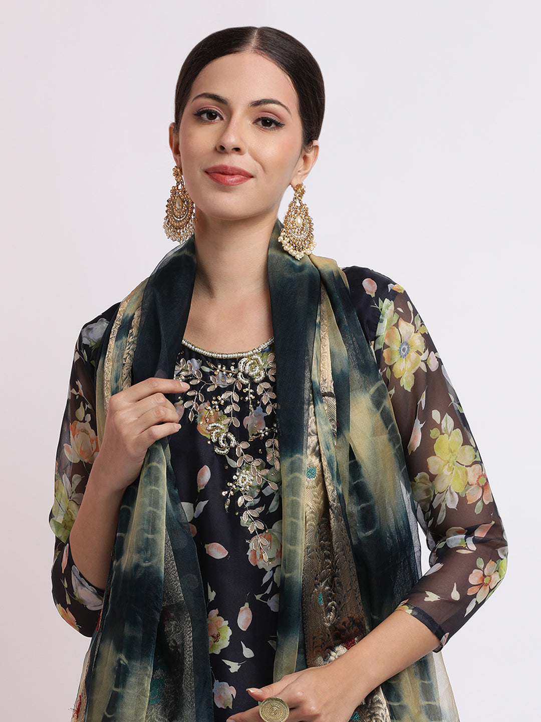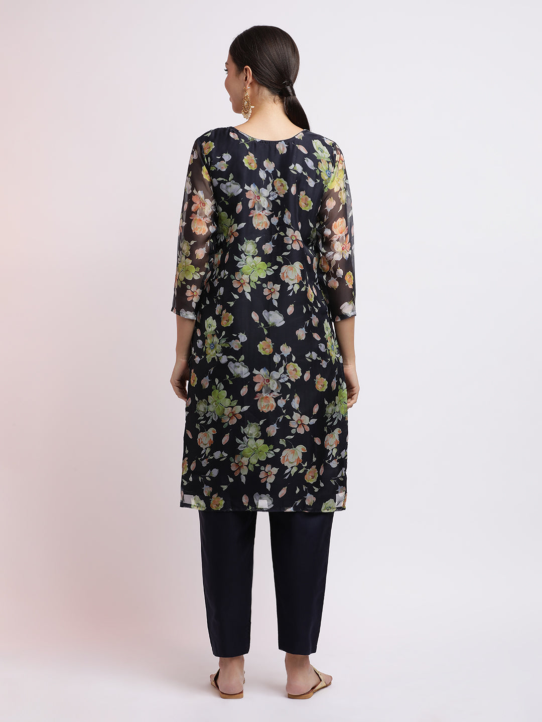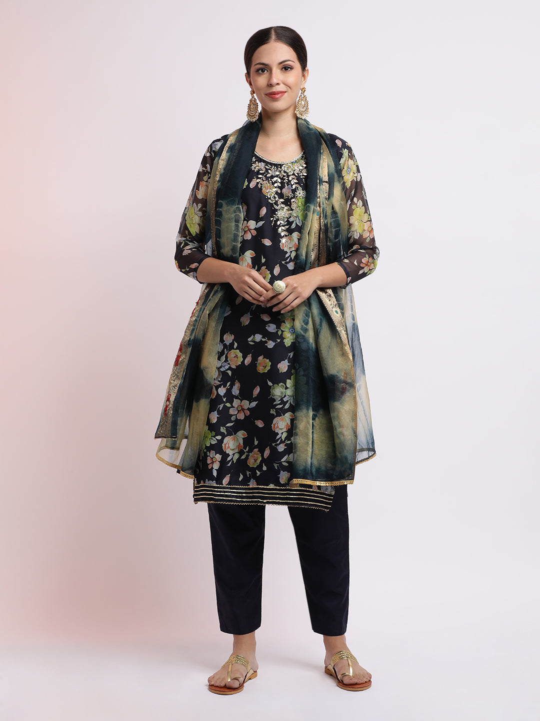 Embrace ethnicity in this Navy Blue Festive Embroidered Floral Organza Kurta Set With Dupatta. The kurta has a boat neck with an embroidered yoke, three-quarter sleeves and a straight hemline. It is paired with solid pyjamas and self woven dupatta.