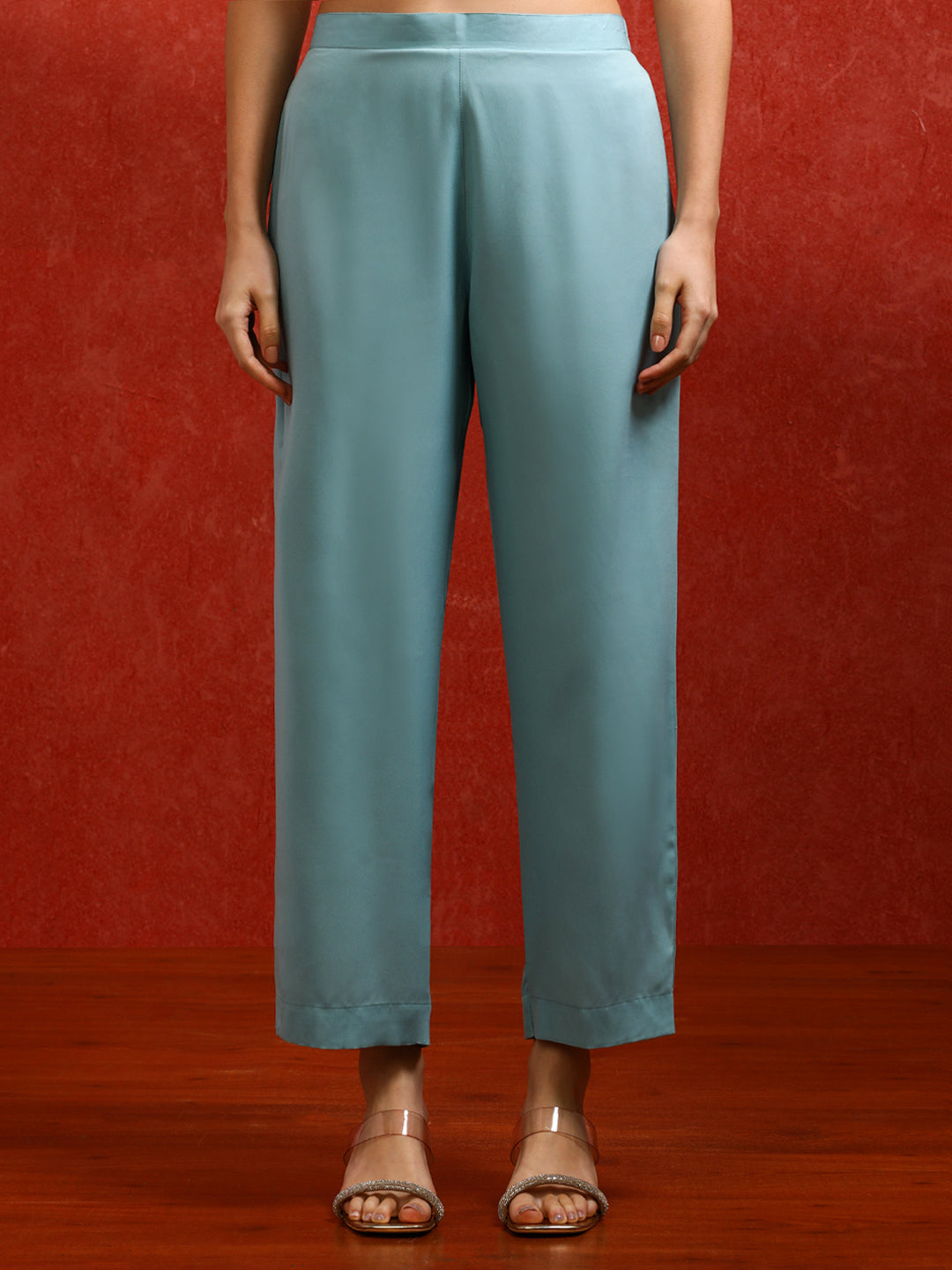 Embrace a comforting style with this Floral Embroidered Silk Blend Sky Blue Kurta Sets. This A-Line Kurta For Women has a Shoulder Straps, Sleeveless With Zari. Paired With a Trousers.