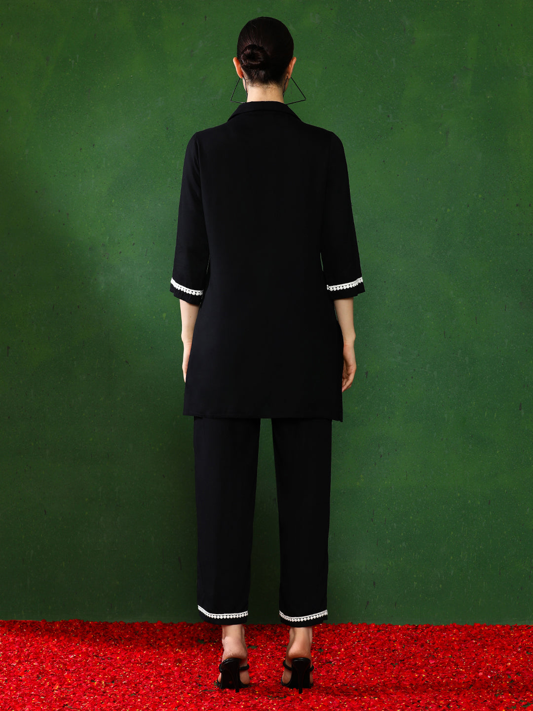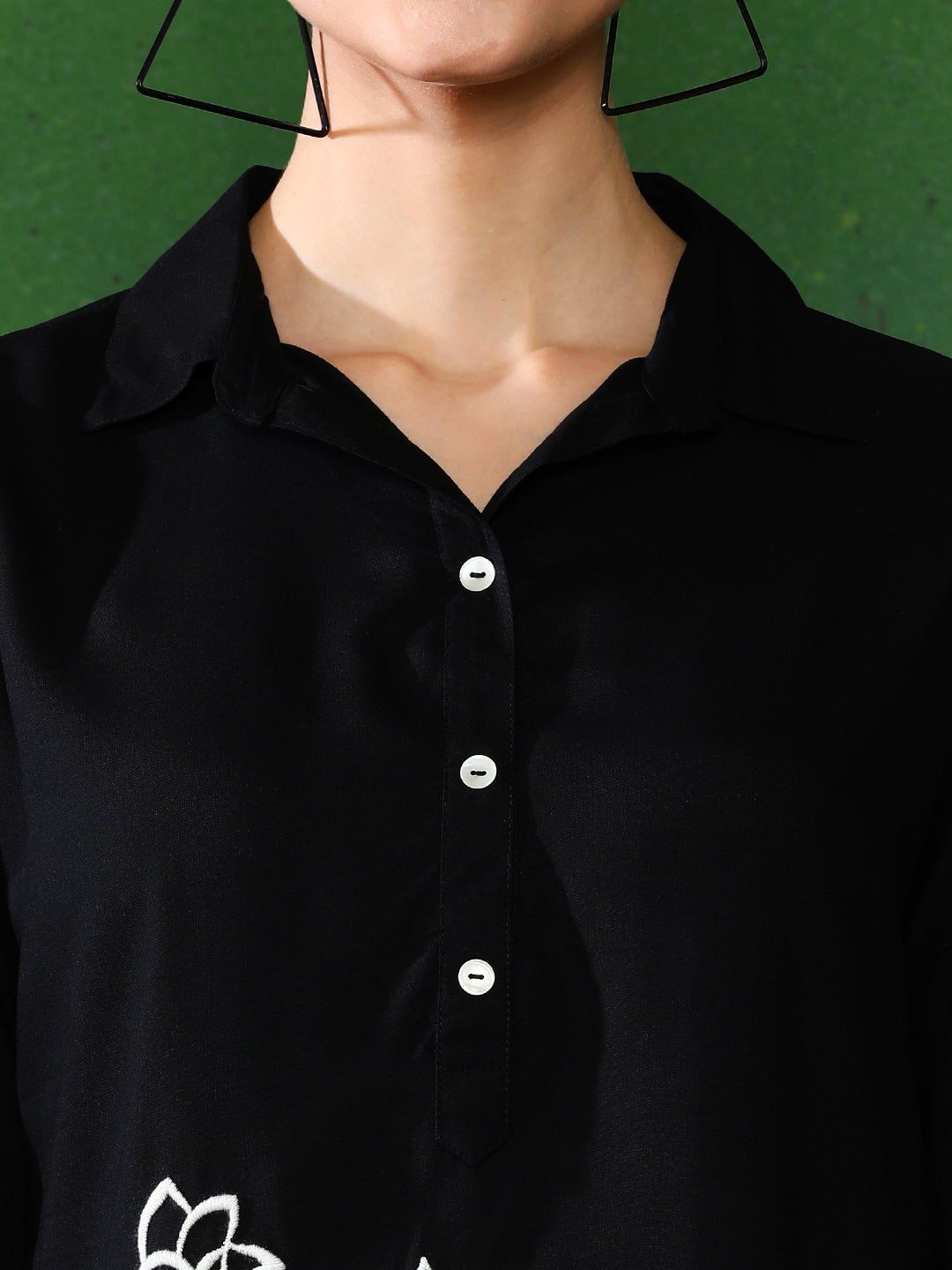 Embrace a comforting style with this Floral Embroidered Viscose Rayon Black Co-Ords. This A-Line Kurta For Women has a Shirt Collar, Three-Quarter Sleeves With Thread Work. Paired With a Trousers.