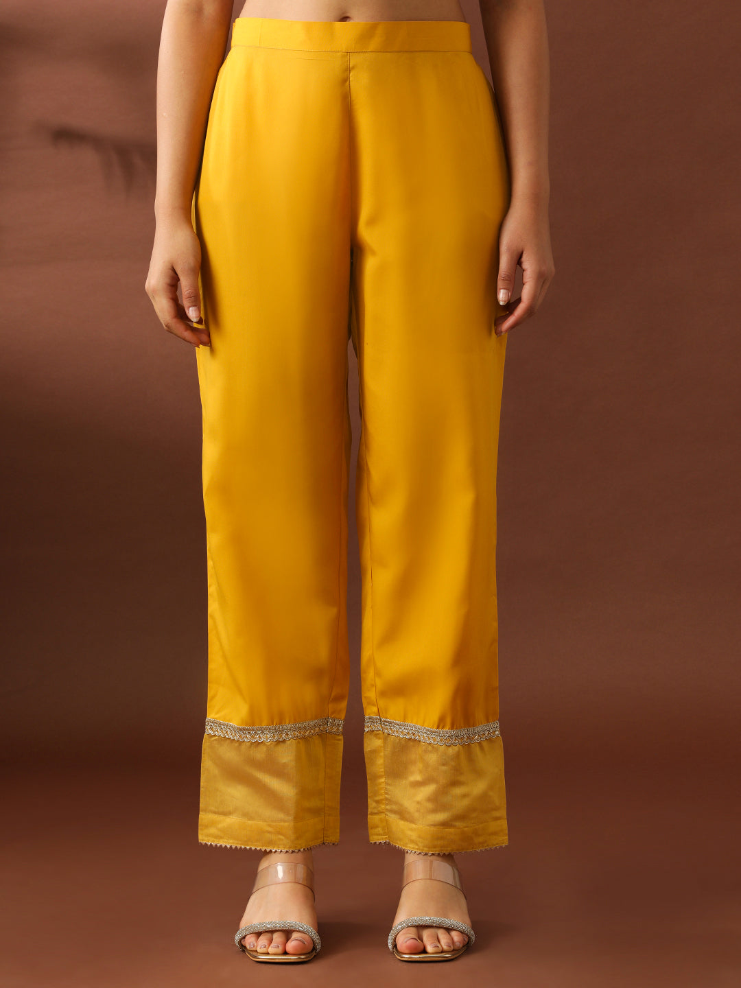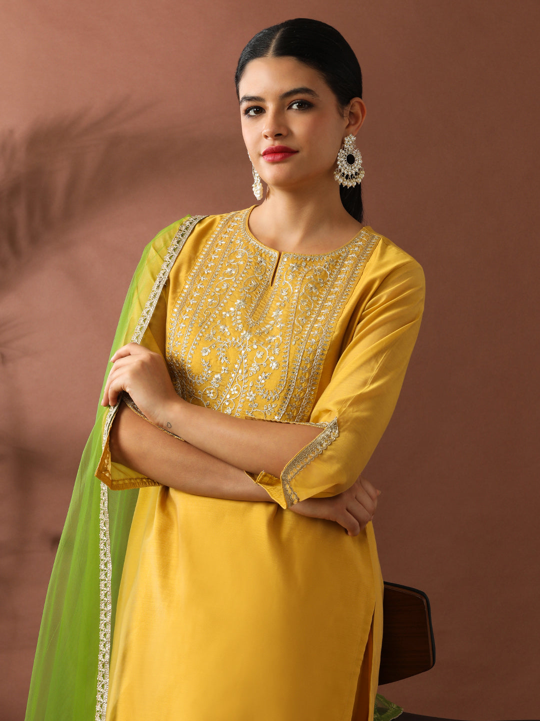 Embrace a comforting style with this Floral Embroidered Chanderi Cotton Yellow Kurta Sets. This Straight Kurta For Women has a Keyhole Neck, Three-Quarter Sleeves With Zari. Paired With a Trousers.