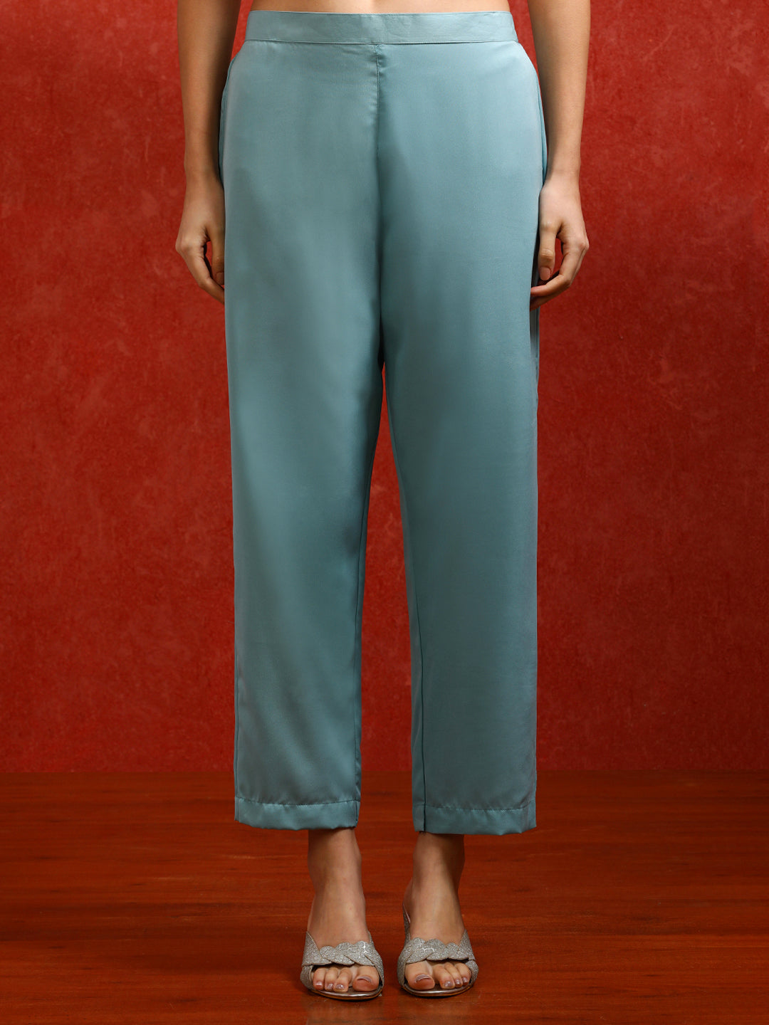 Embrace a comforting style with this Floral Embroidered Cotton Blend Sky Blue Kurta Sets. This Straight Kurta For Women has a Keyhole Neck, Three-Quarter Sleeves With Thread Work. Paired With a Trousers.