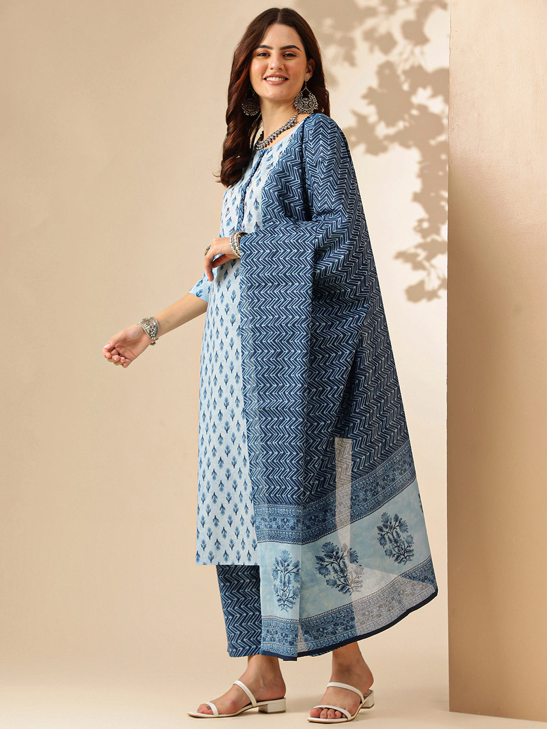 Embrace a comforting style with this Floral Embroidered Pure Cotton Blue Kurta Set. This Straight Kurta For Women has a Round Neck, Three-Quarter Sleeves With Beads and Stones. Paired With a Trousers.