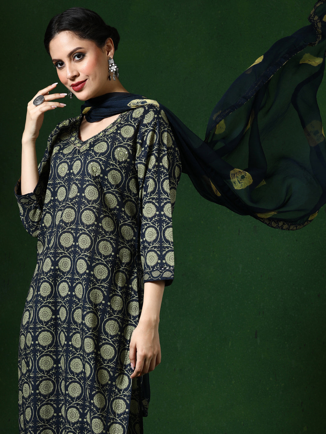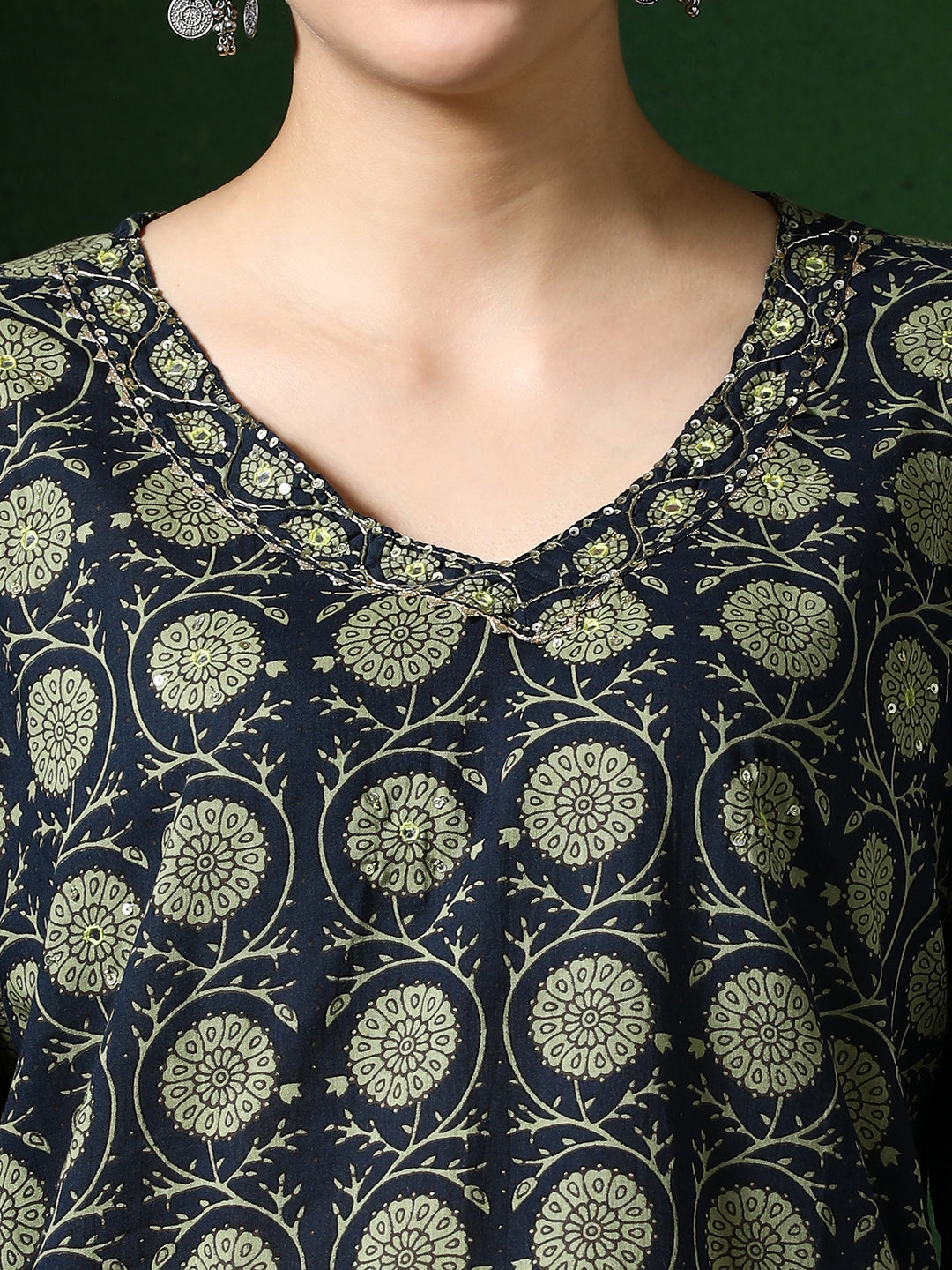 Embrace a comforting style with this Floral Embroidered Pure Cotton Navy Blue Kurta Set. This Straight Kurta For Women has a V-Neck, Three-Quarter Sleeves With Beads and Stones. Paired With a Trousers.