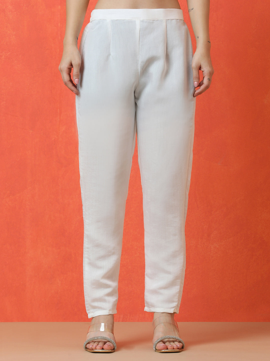 Embrace a comforting style with this Floral Embroidered Chanderi Silk Cream Kurta Sets. This Straight Kurta For Women has a Round Neck, Three-Quarter Sleeves With Zardozi. Paired With a Trousers.