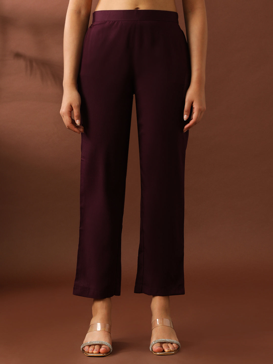 Embrace a comforting style with this Floral Embroidered Silk Blend Wine Kurta Sets. This Straight Kurta For Women has a Keyhole Neck, Three-Quarter Sleeves With Zari. Paired With a Trousers.