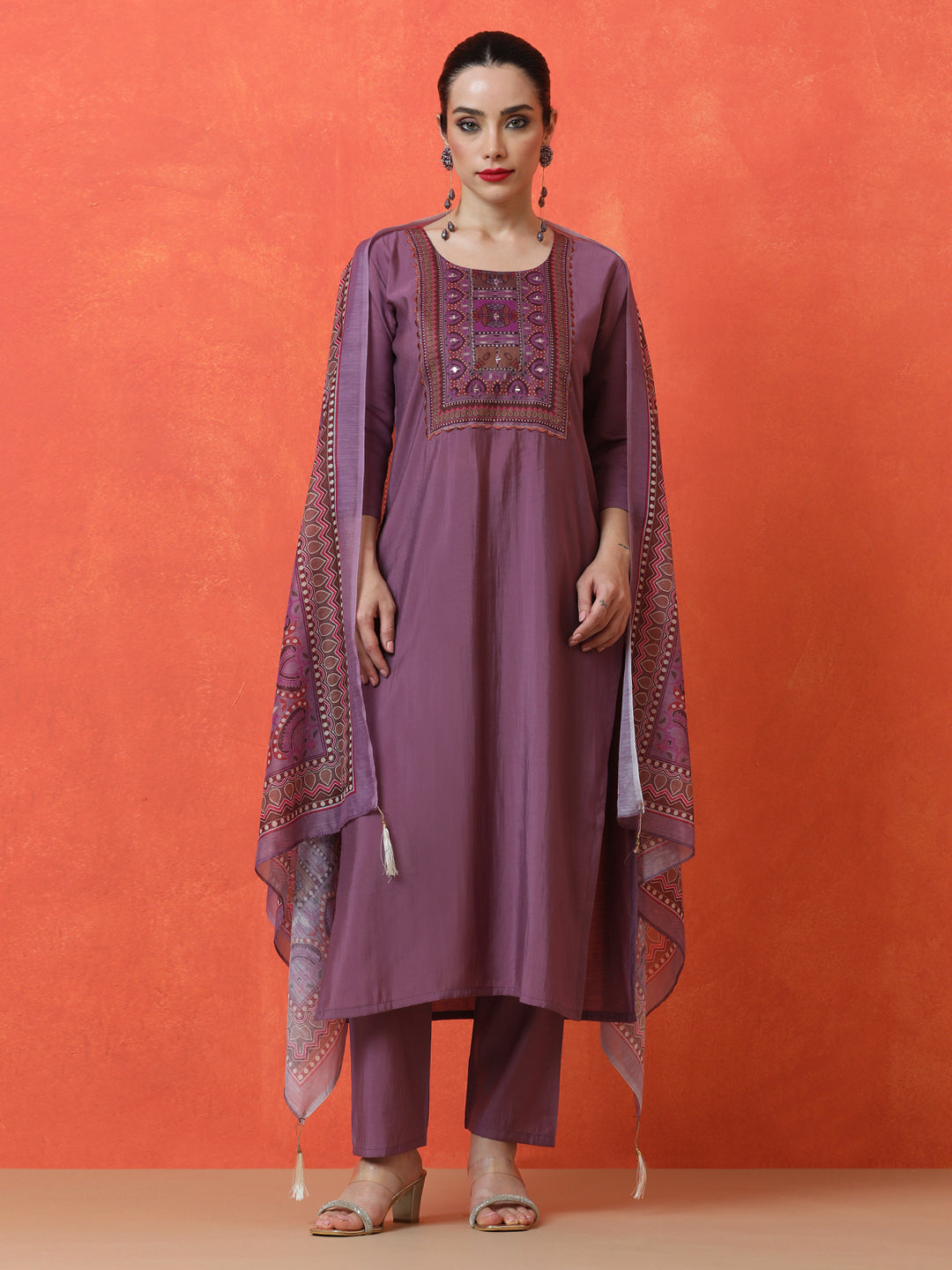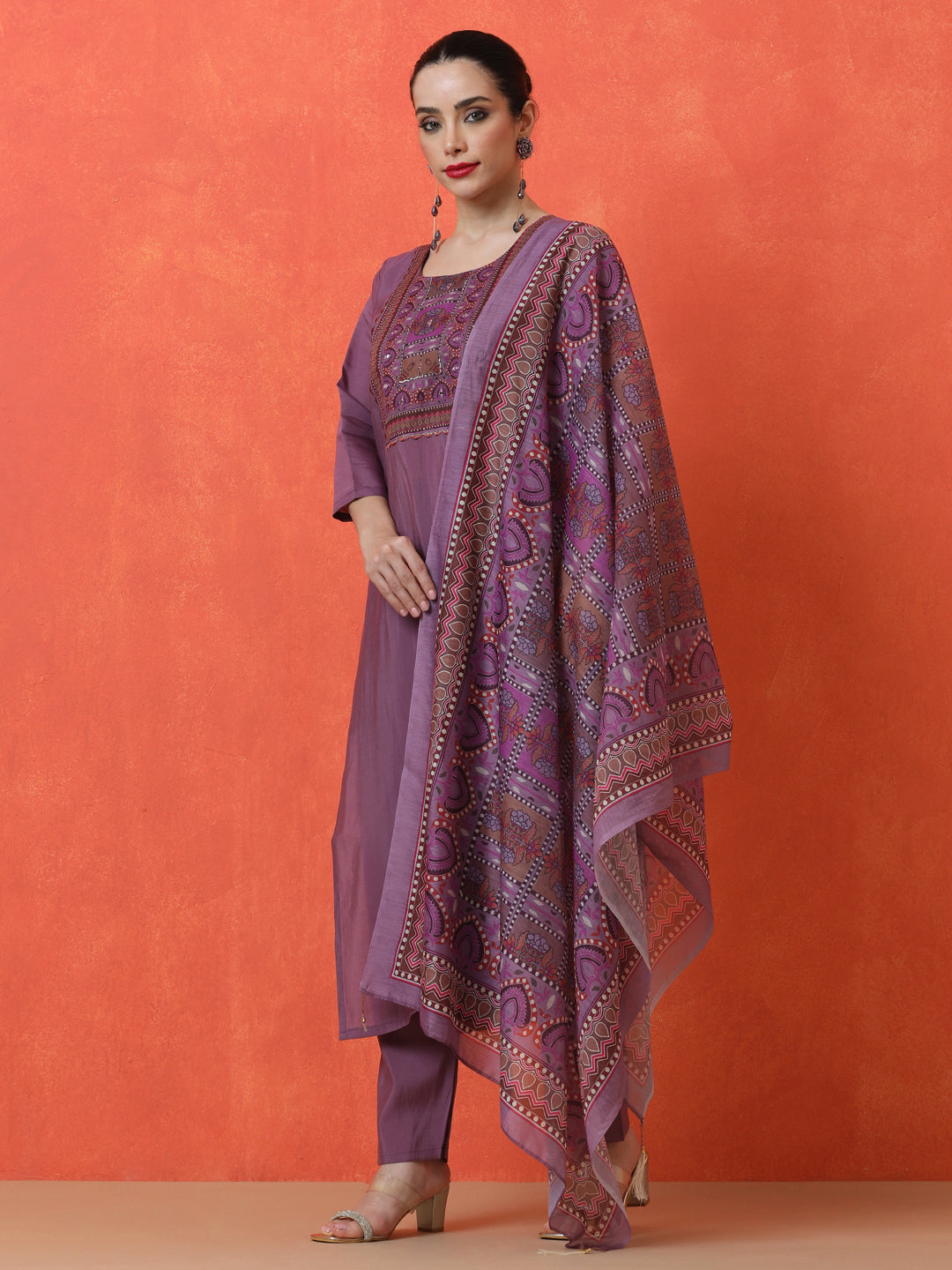 Embrace a comforting style with this Floral Embroidered Silk Blend Lavender Kurta Sets. This Straight Kurta For Women has a Square Neck, Three-Quarter Sleeves With Gotta Patti. Paired With a Trousers.