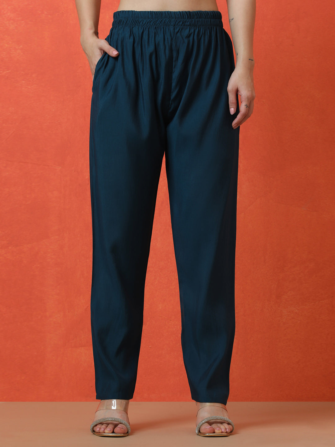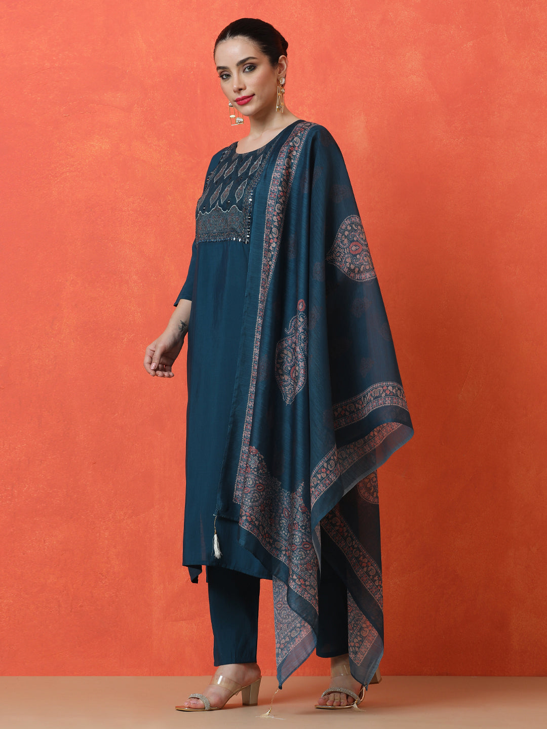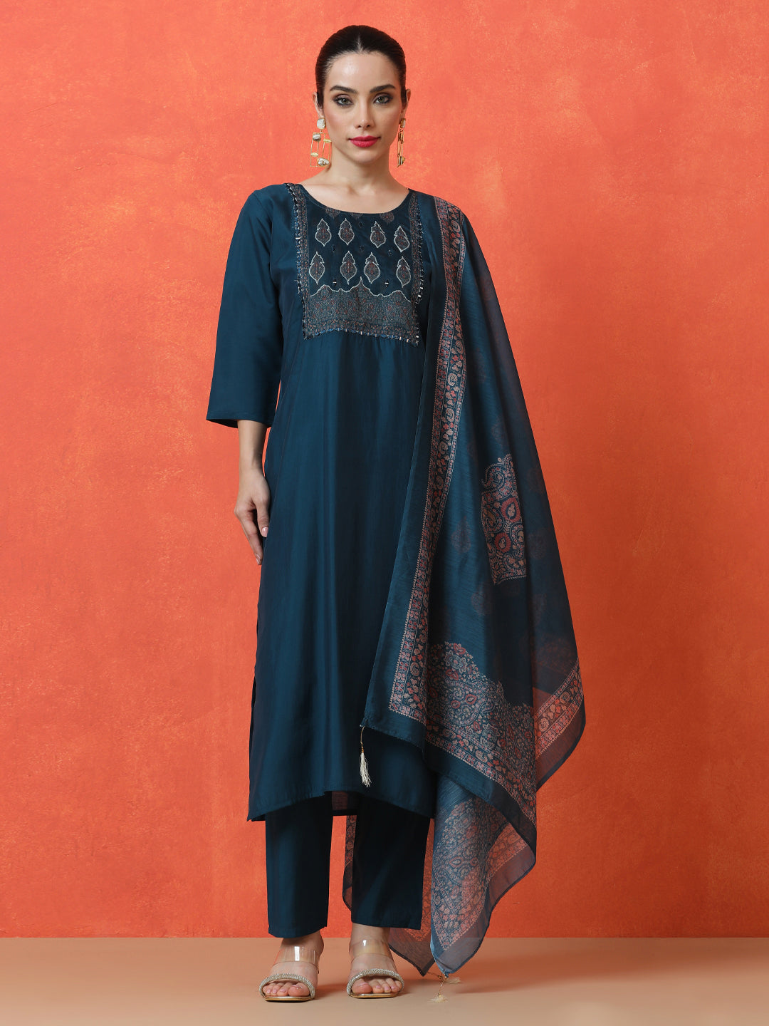 Embrace a comforting style with this Floral Embroidered Silk Blend Turquoise Kurta Sets. This Straight Kurta For Women has a Round Neck, Three-Quarter Sleeves With Mirror Work. Paired With a Trousers.
