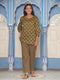 Brown cotton printed tunic has round neck and three-quarter sleeves, side slits, straight hemline, brown printed loose pants have side pockets and partially elasticated at waist.