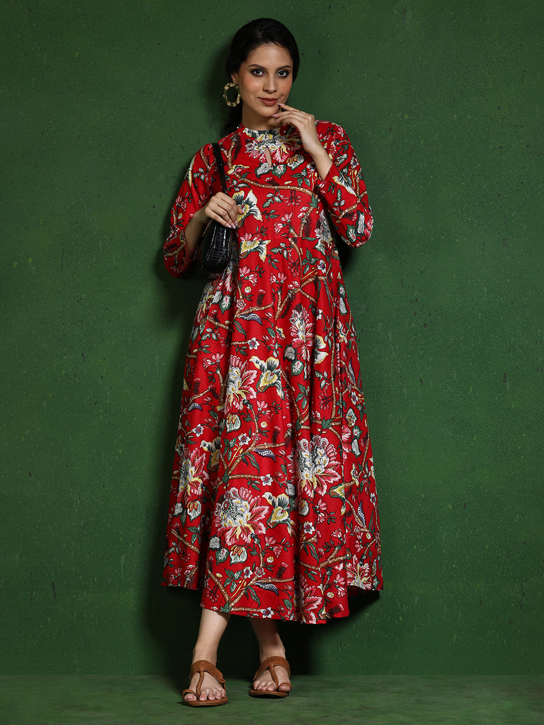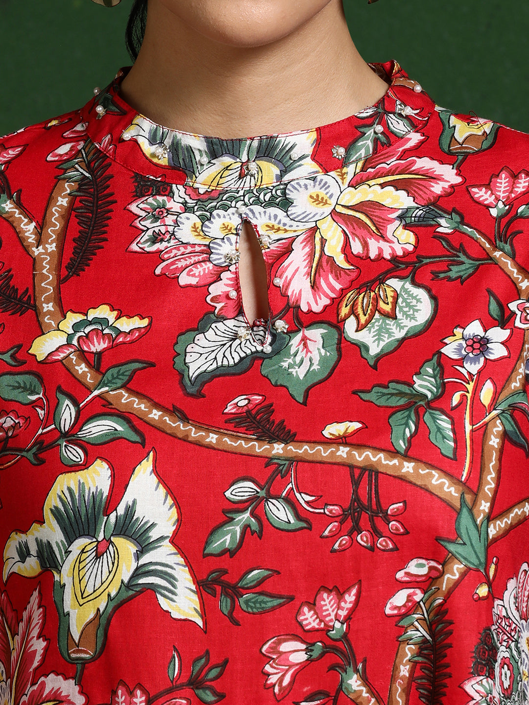 Embrace a comforting style with this Floral Printed Pure Cotton Red Dress. This A-Line Kurta For Women has a Mandarin Collar, Long Sleeves With Beads and Stones.