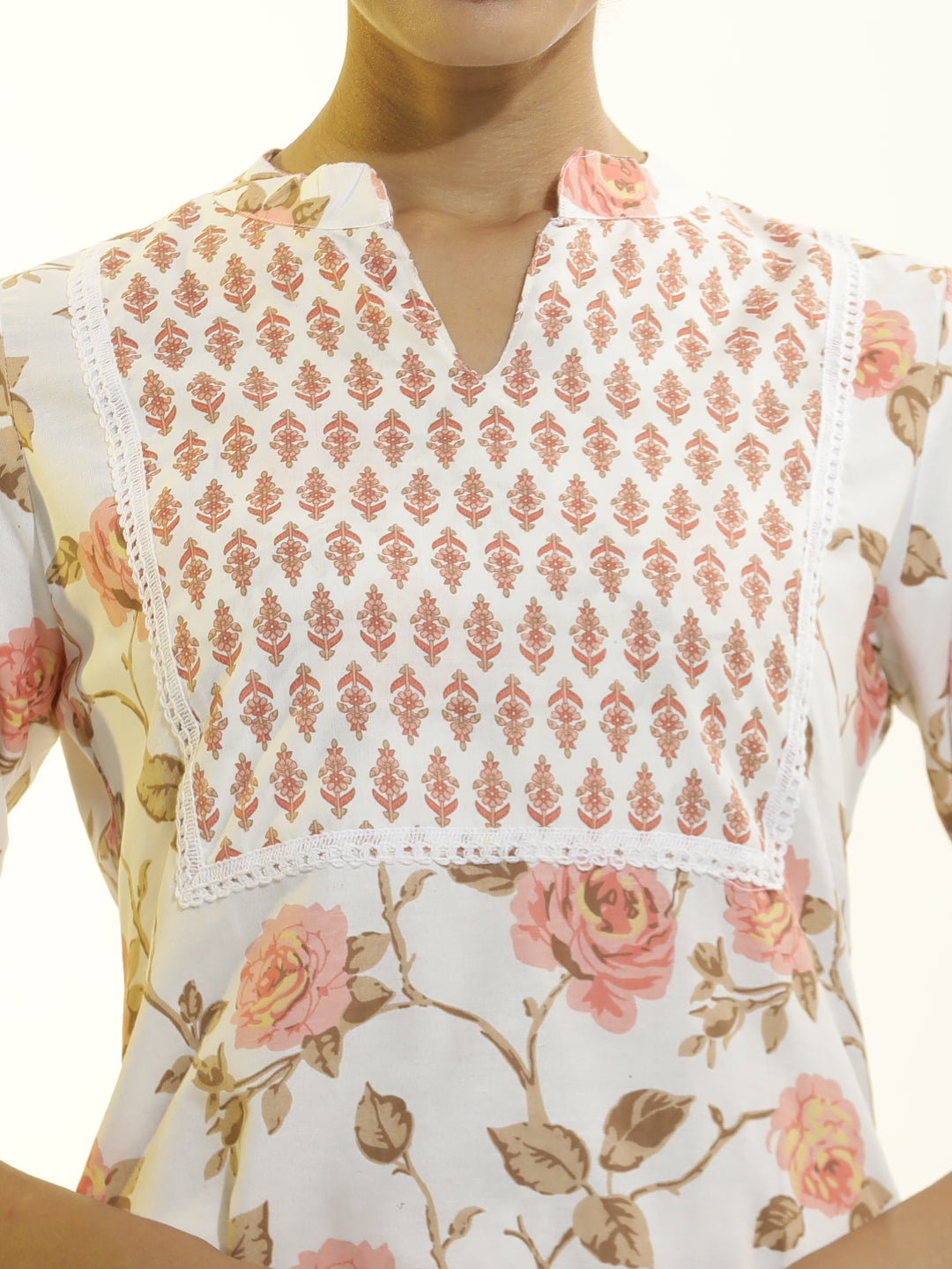 An everyday must-have, this White Floral Printed Cotton Blend Kurta Set has a subtle style. The kurta has a mandarin collar, three-quarter sleeves and lace details. It is paired with elasticated printed trousers with side pockets.