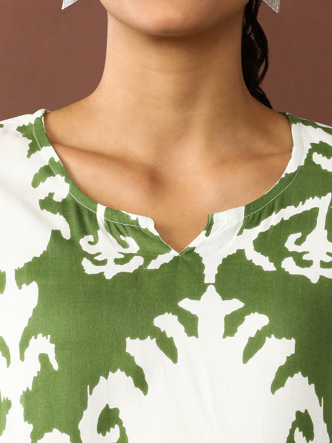 Embrace a comforting style with this Floral Printed Viscose Rayon Pista Green Kurta Sets. This Straight Kurta For Women has a V-Neck, Three-Quarter Sleeves. Paired With a Trousers.