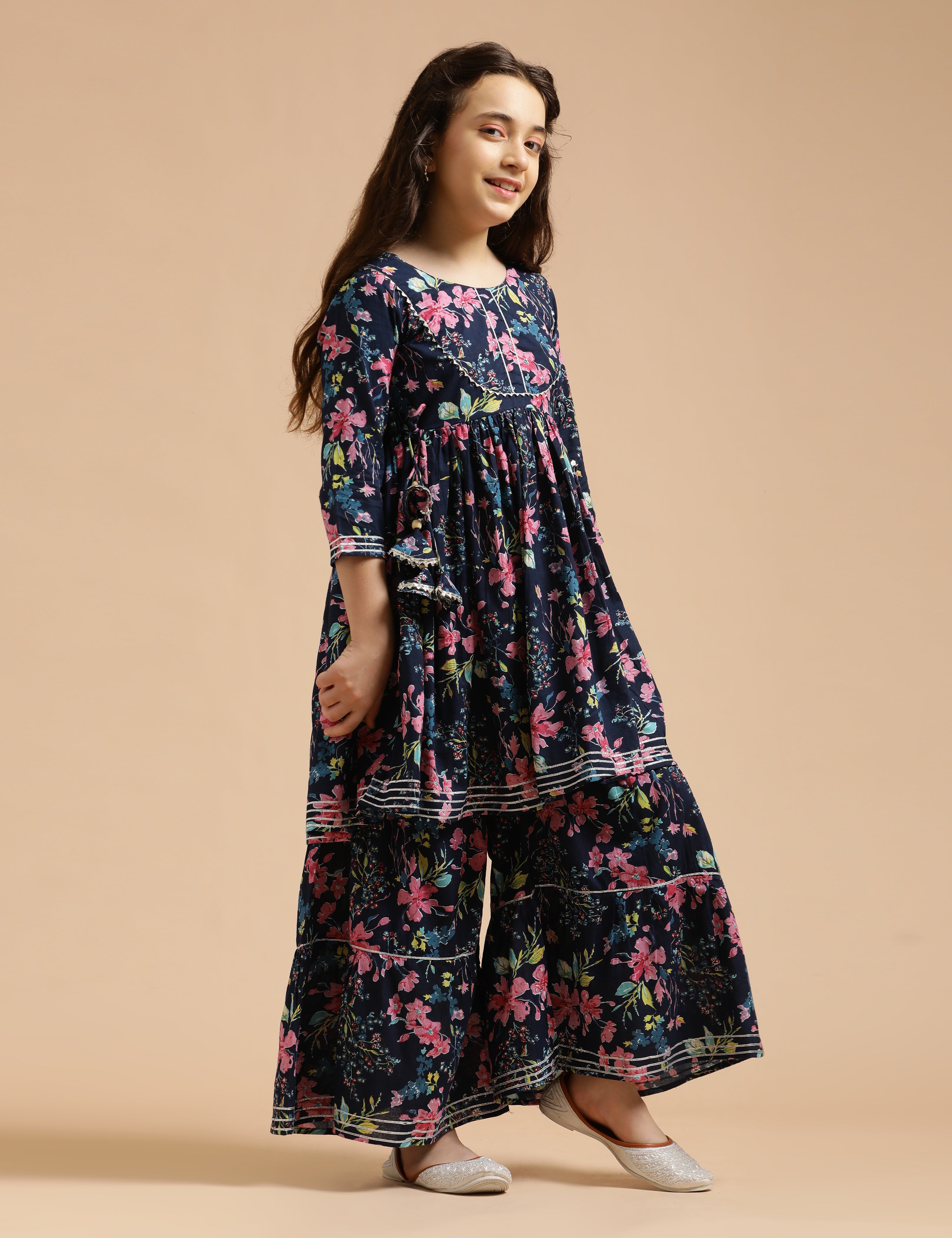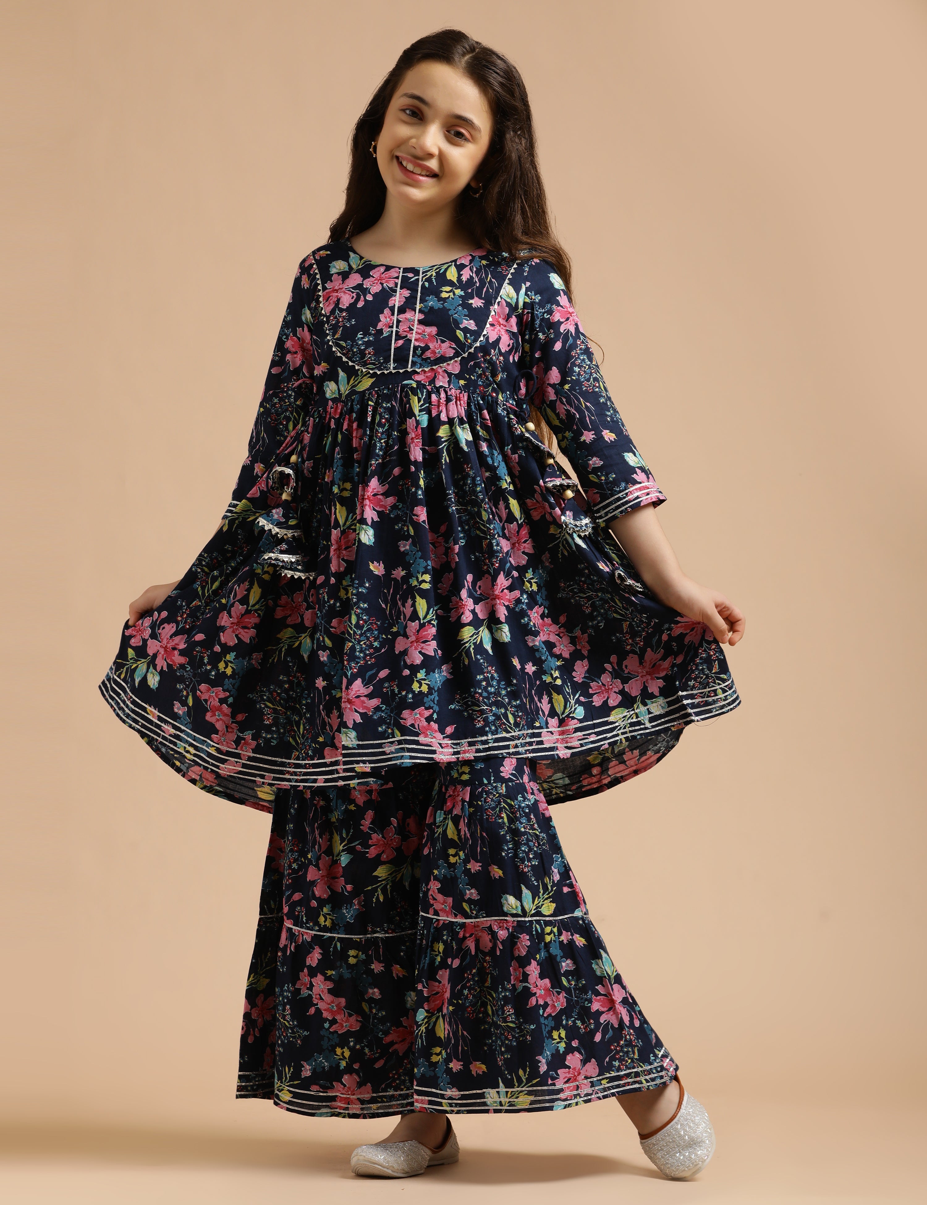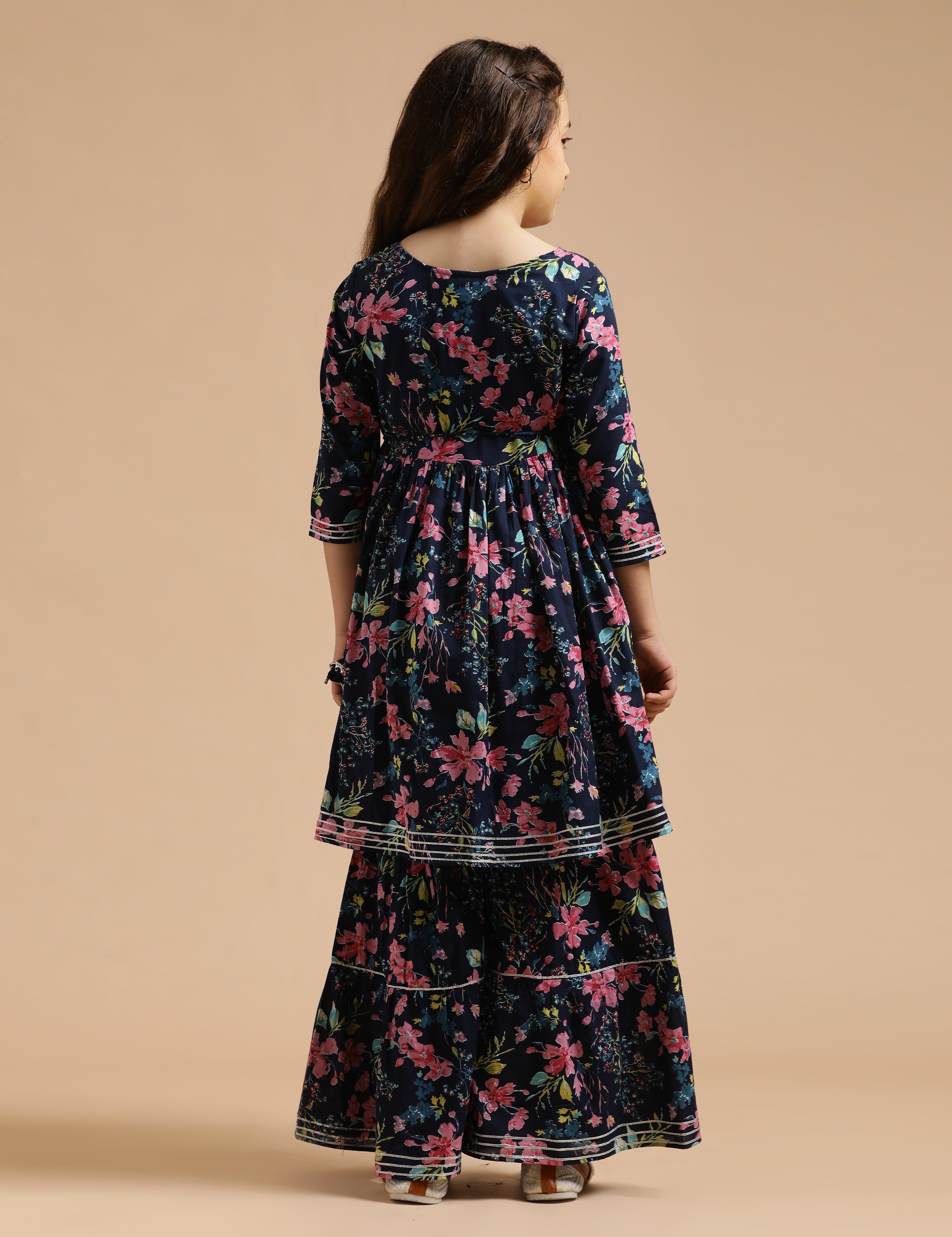 Embrace a comforting style with this Floral Embroidered Pure Cotton Navy Blue Kids Kurta Sets. This Anarkali Kurta For Kids Girls has a Round Neck, Three-Quarter Sleeves With Gotta Patti. Paired With a Sharara.