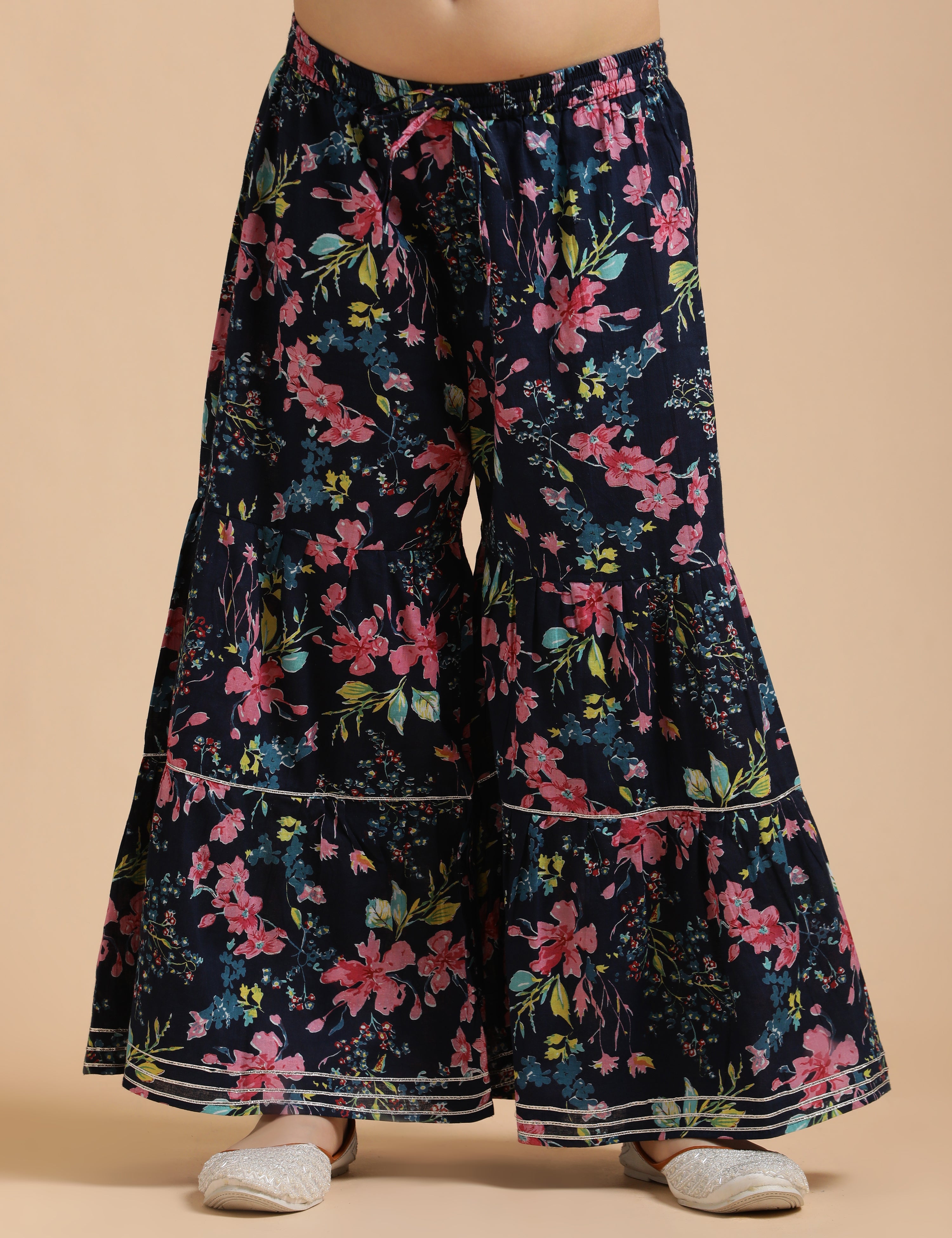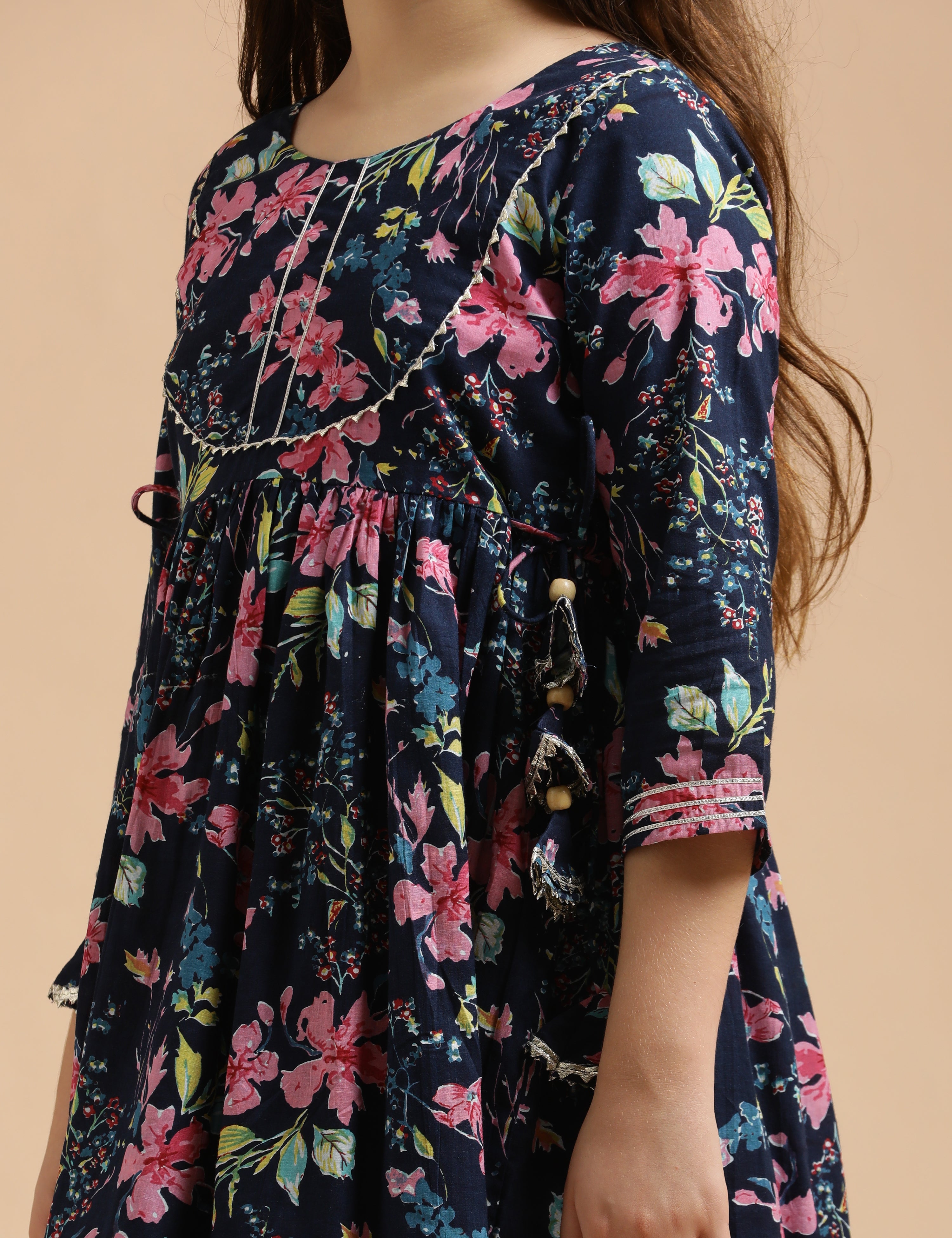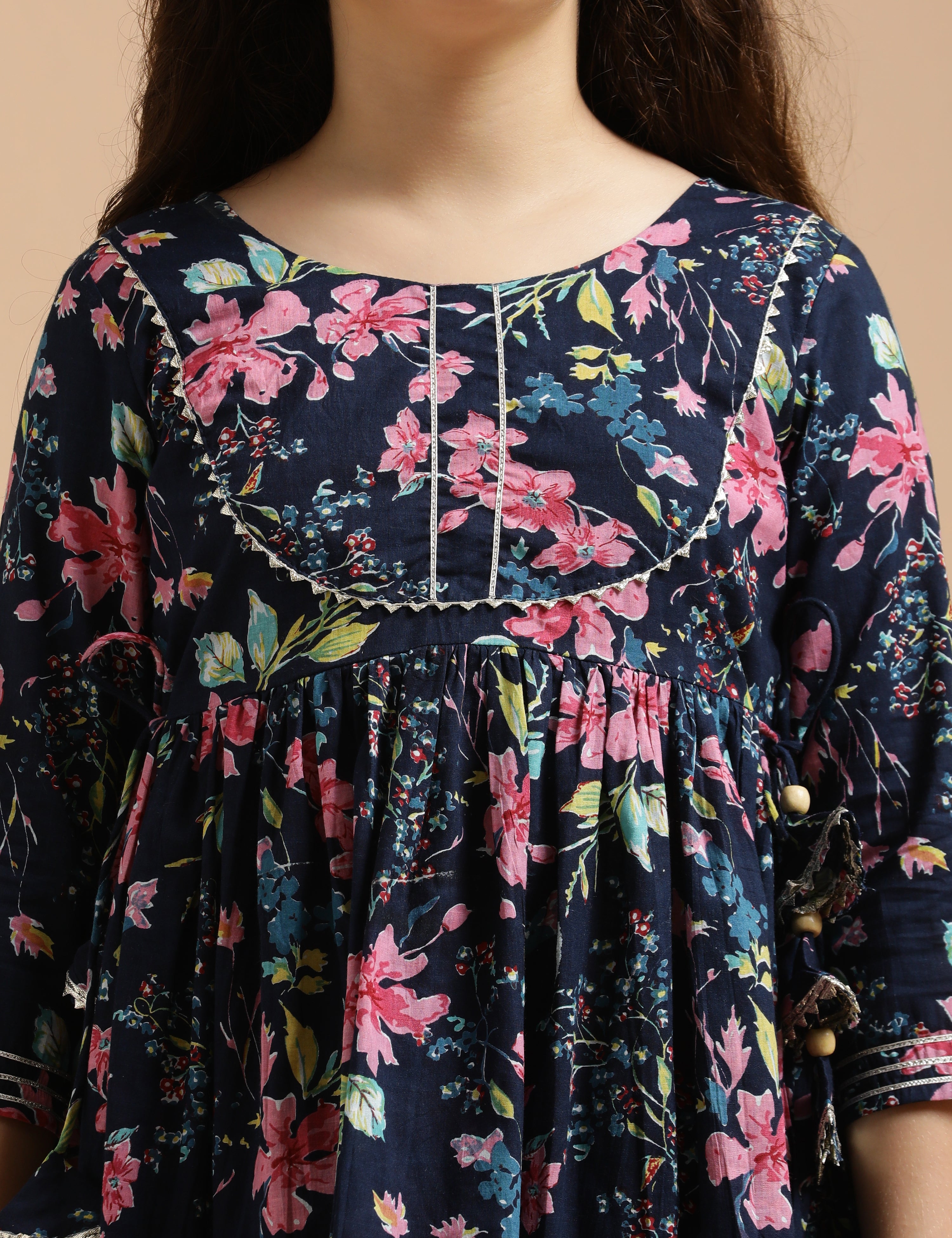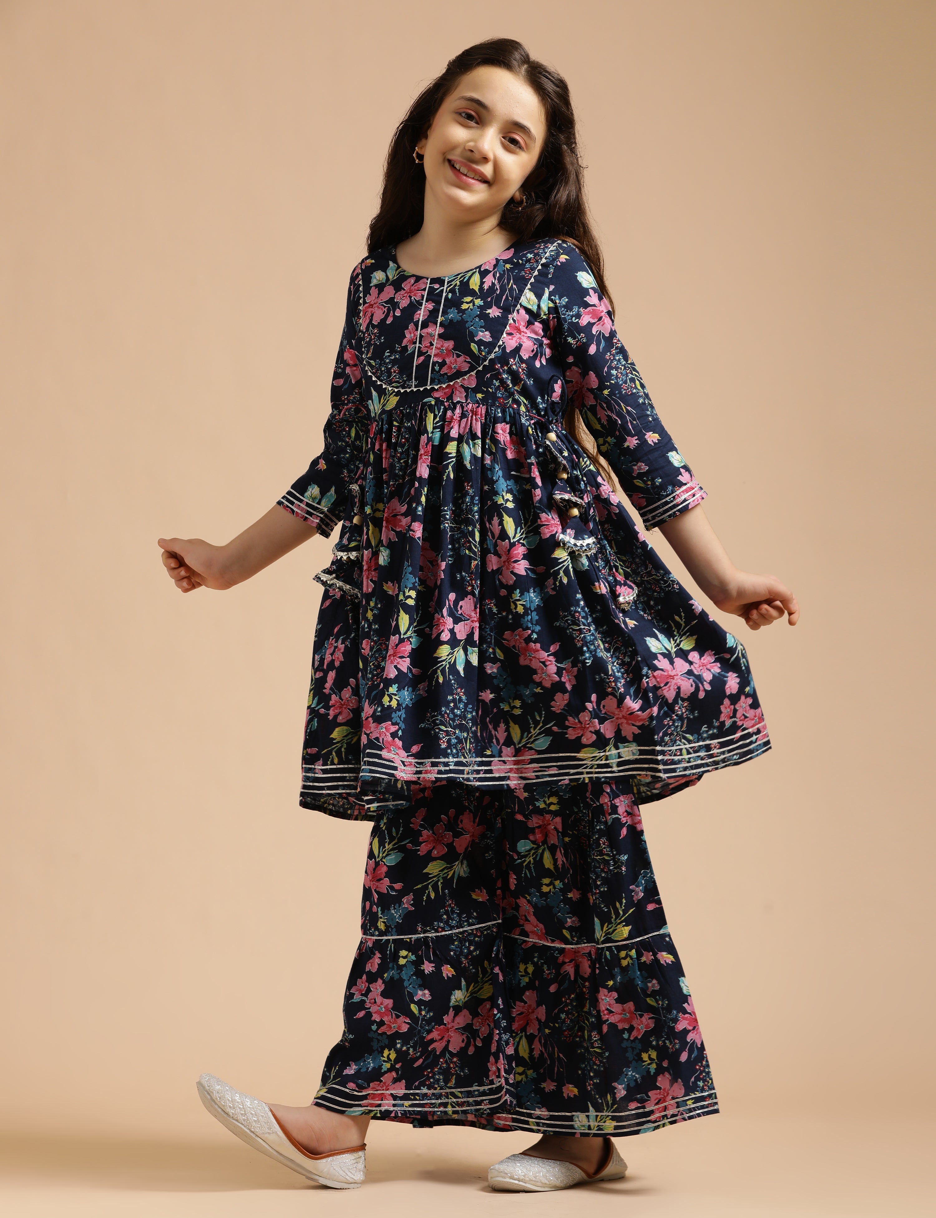 Embrace a comforting style with this Floral Embroidered Pure Cotton Navy Blue Kids Kurta Sets. This Anarkali Kurta For Kids Girls has a Round Neck, Three-Quarter Sleeves With Gotta Patti. Paired With a Sharara.