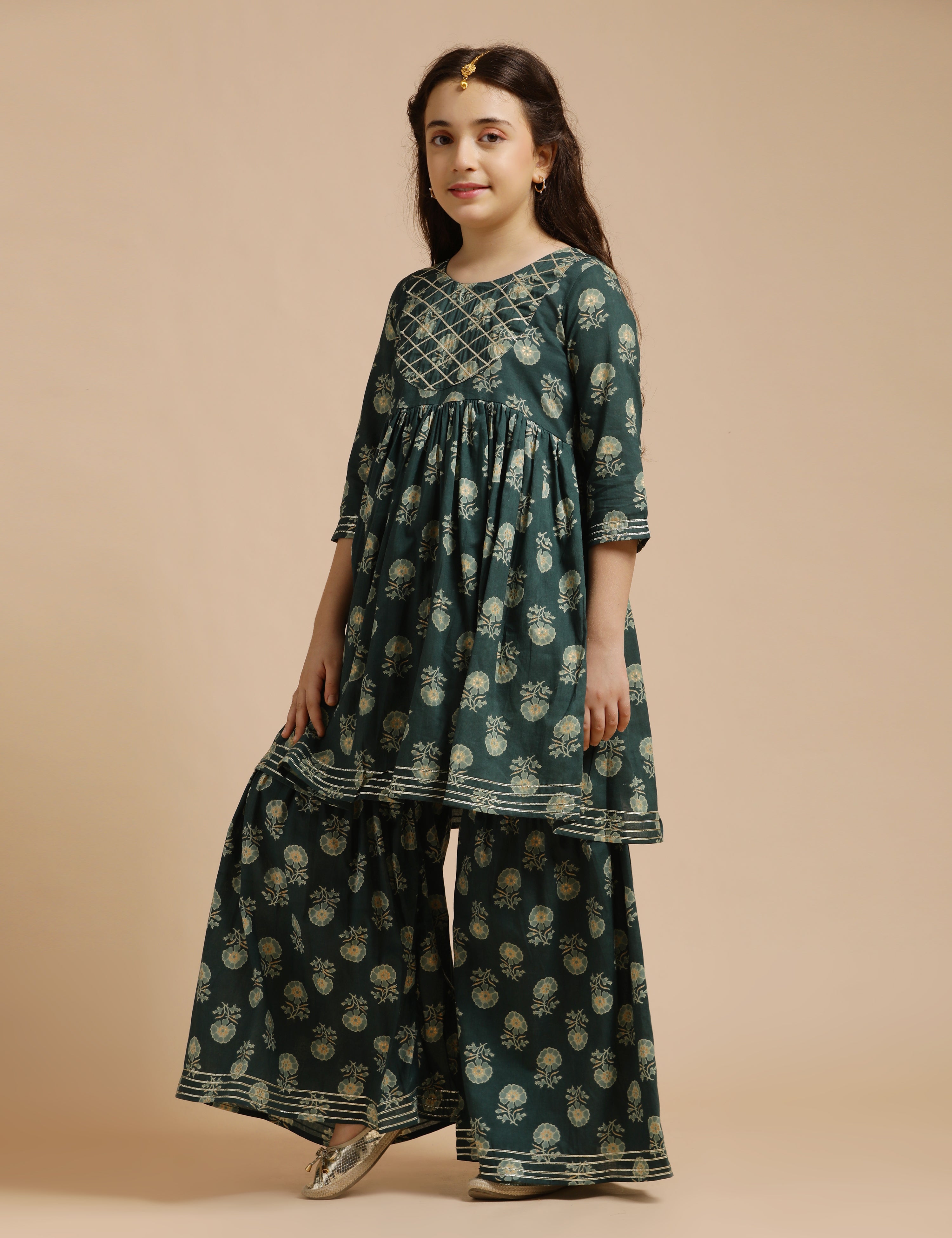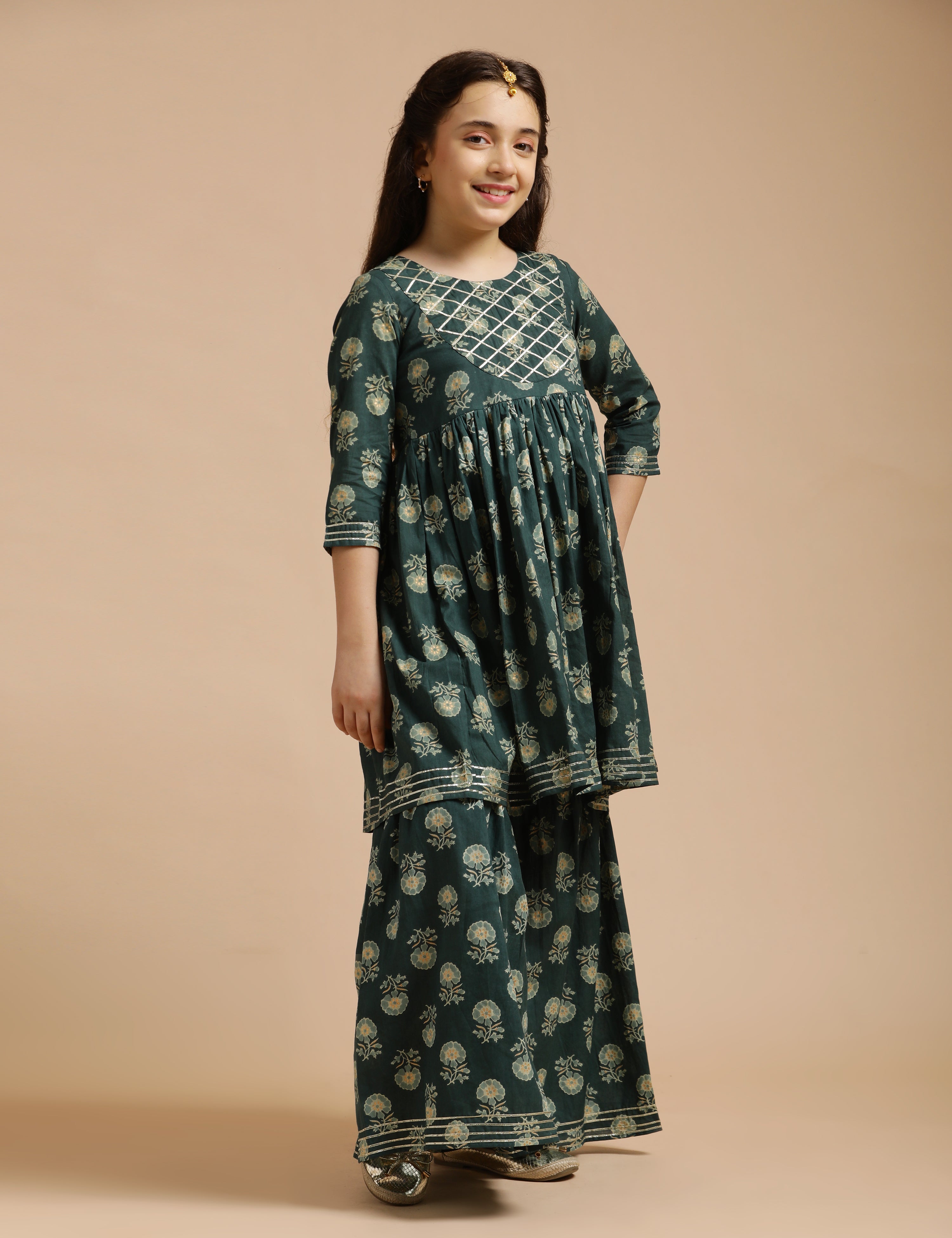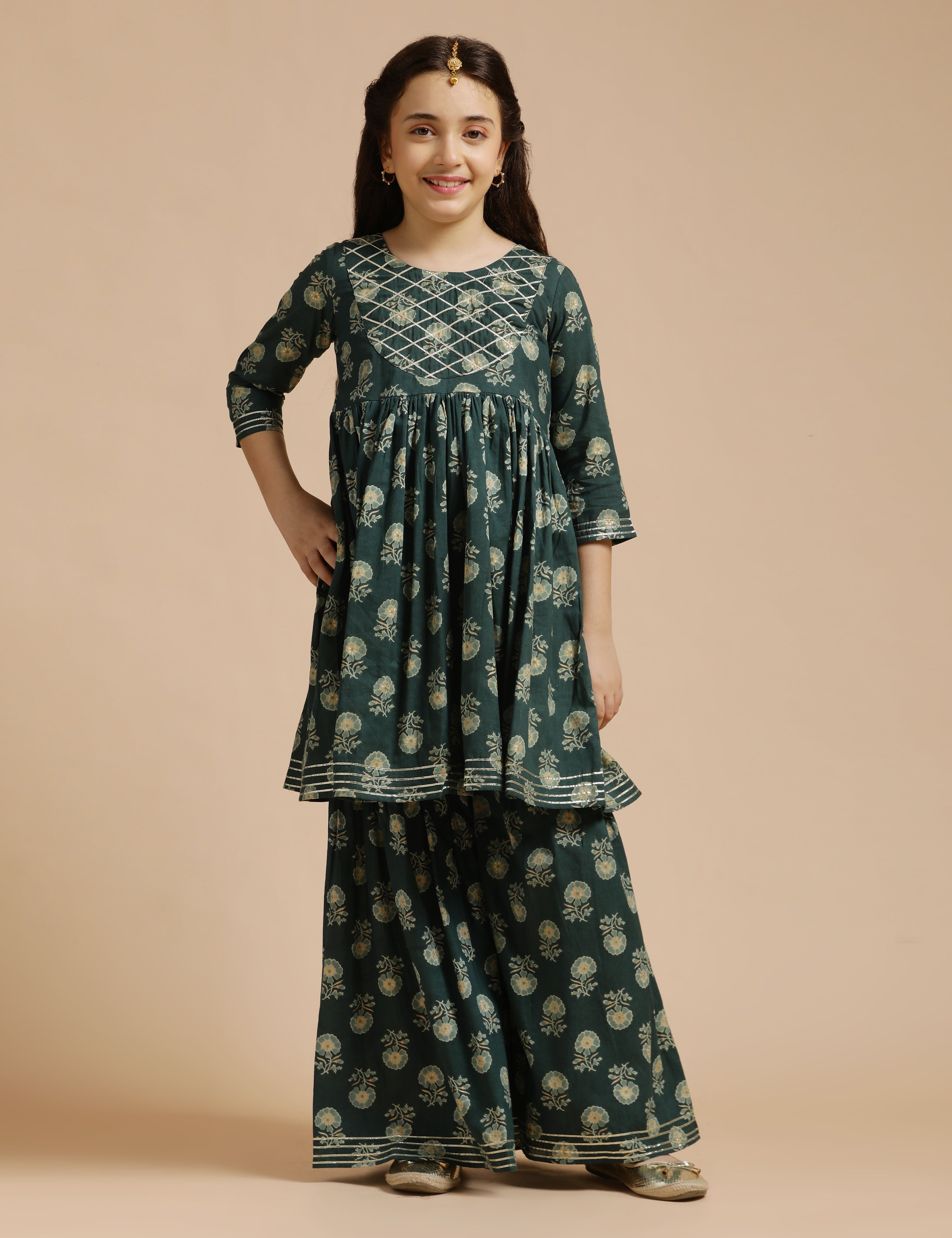 Embrace a comforting style with this Floral Embroidered Pure Cotton Green Kids Kurta Sets. This Anarkali Kurta For Kids Girls has a Round Neck, Three-Quarter Sleeves With Gotta Patti. Paired With a Sharara.