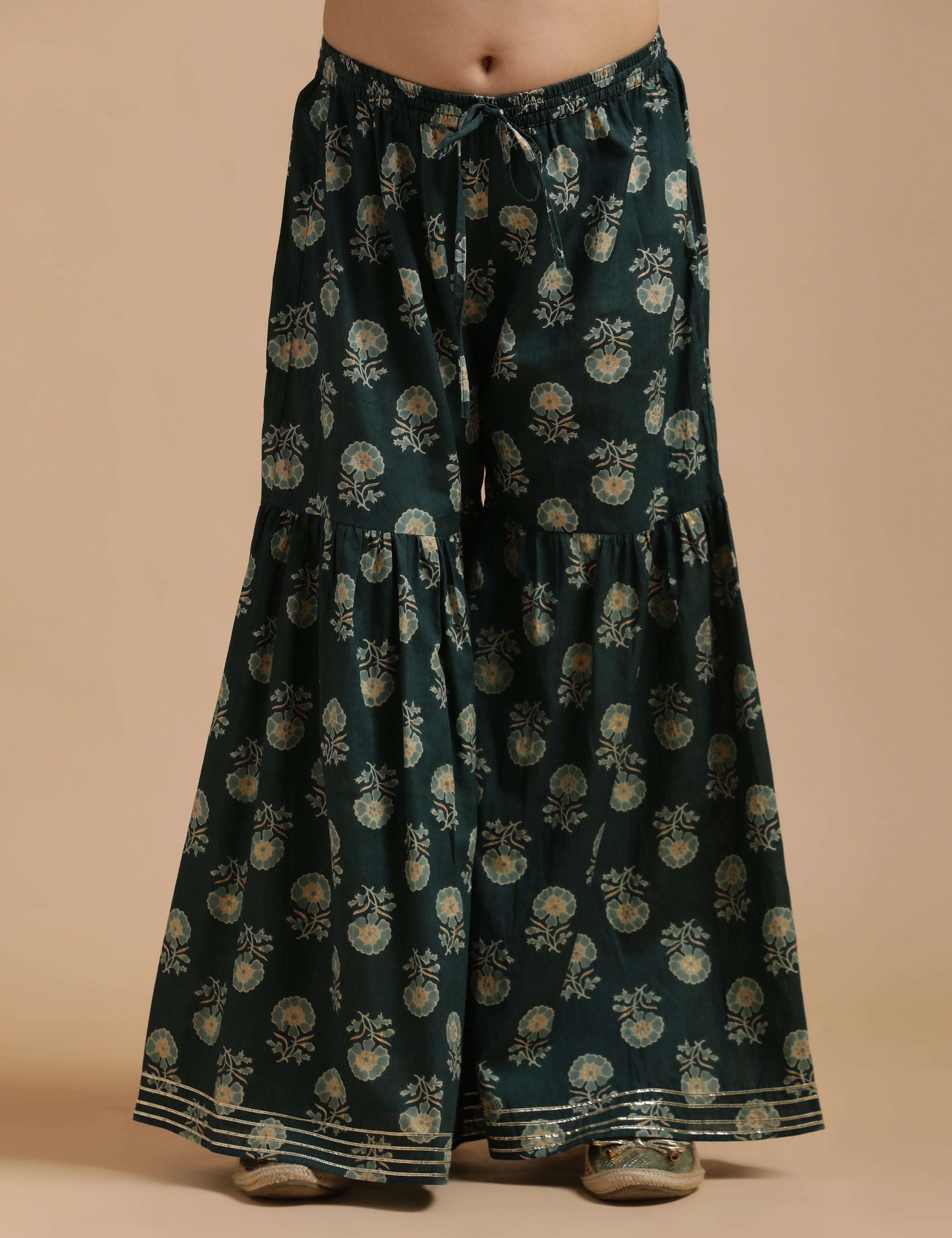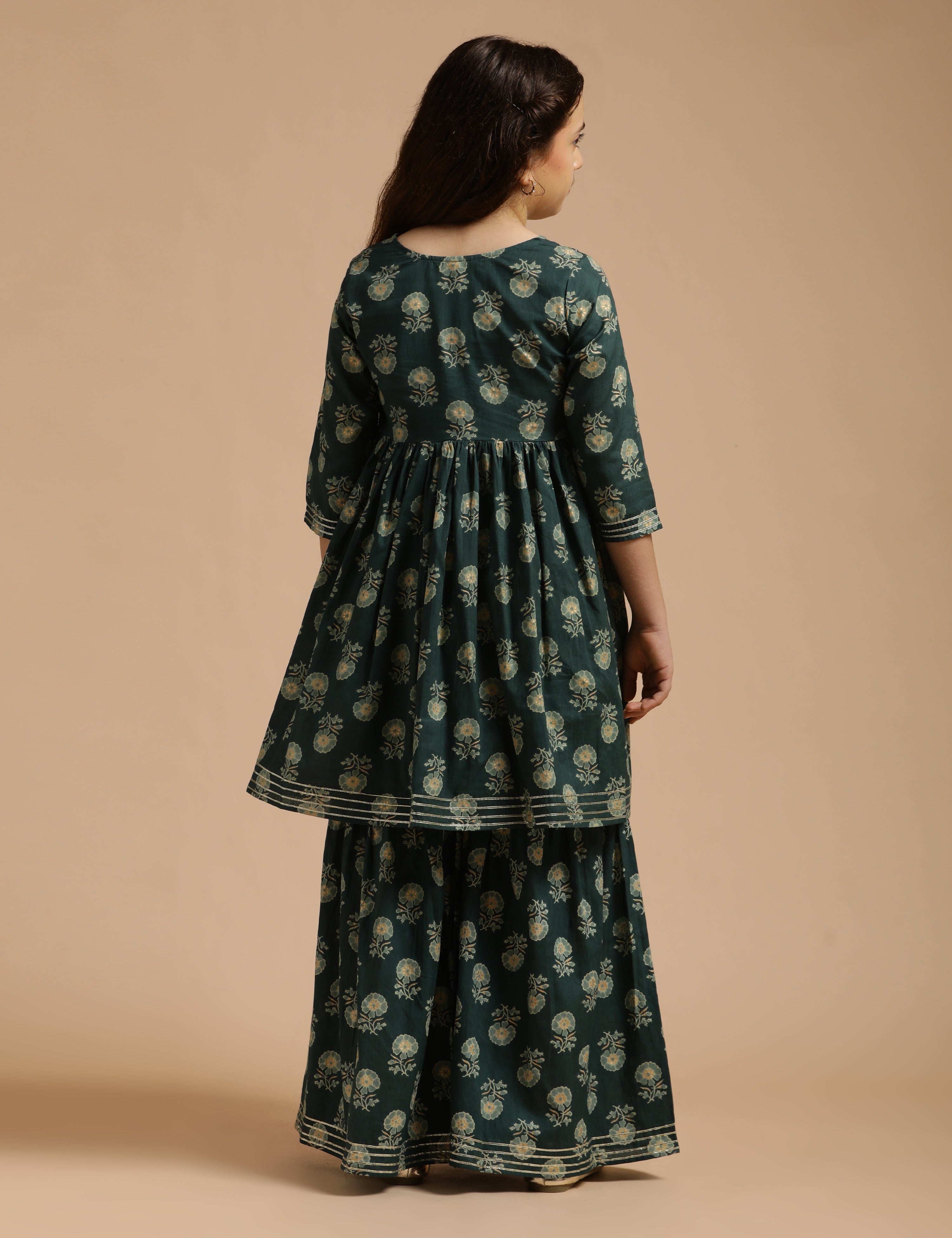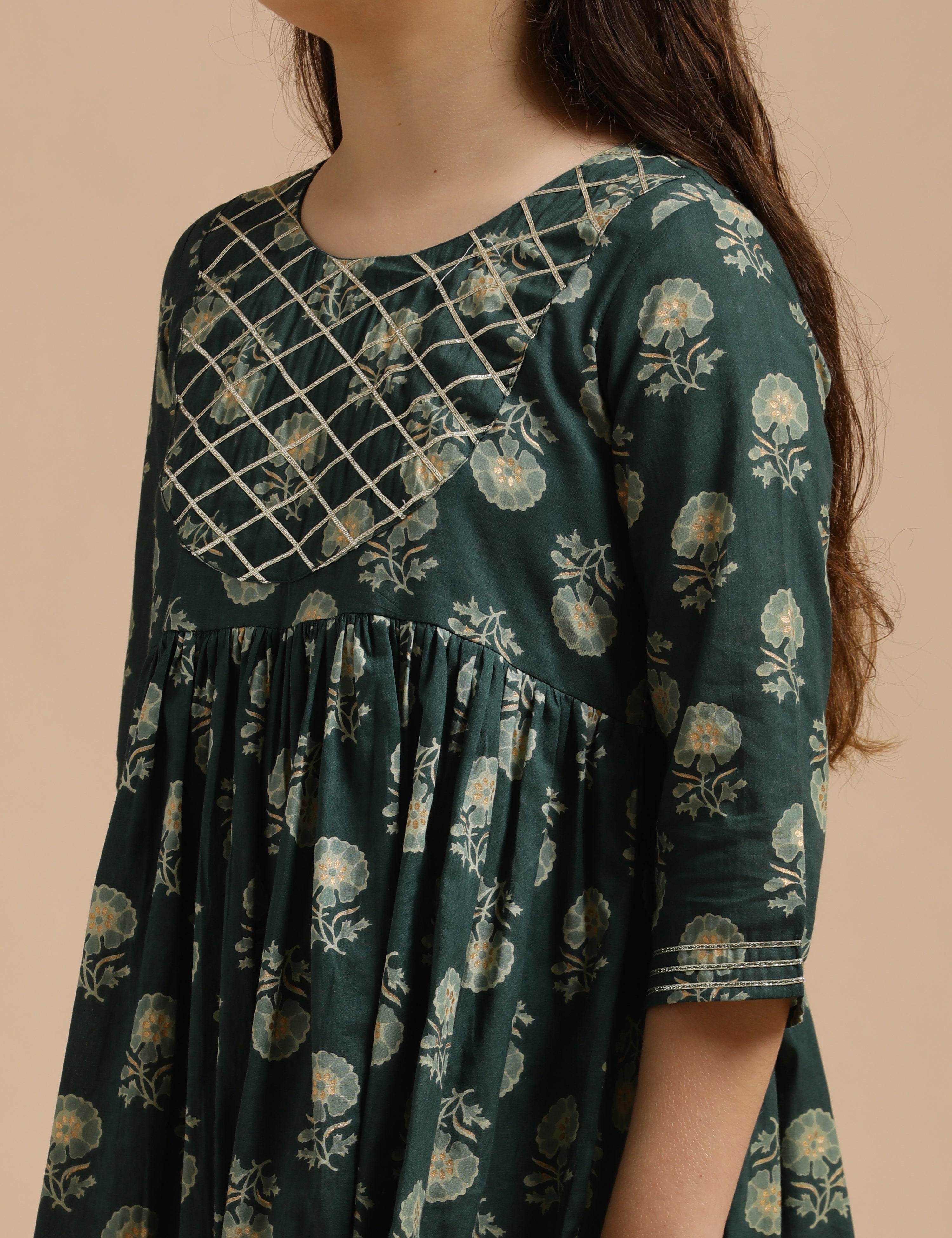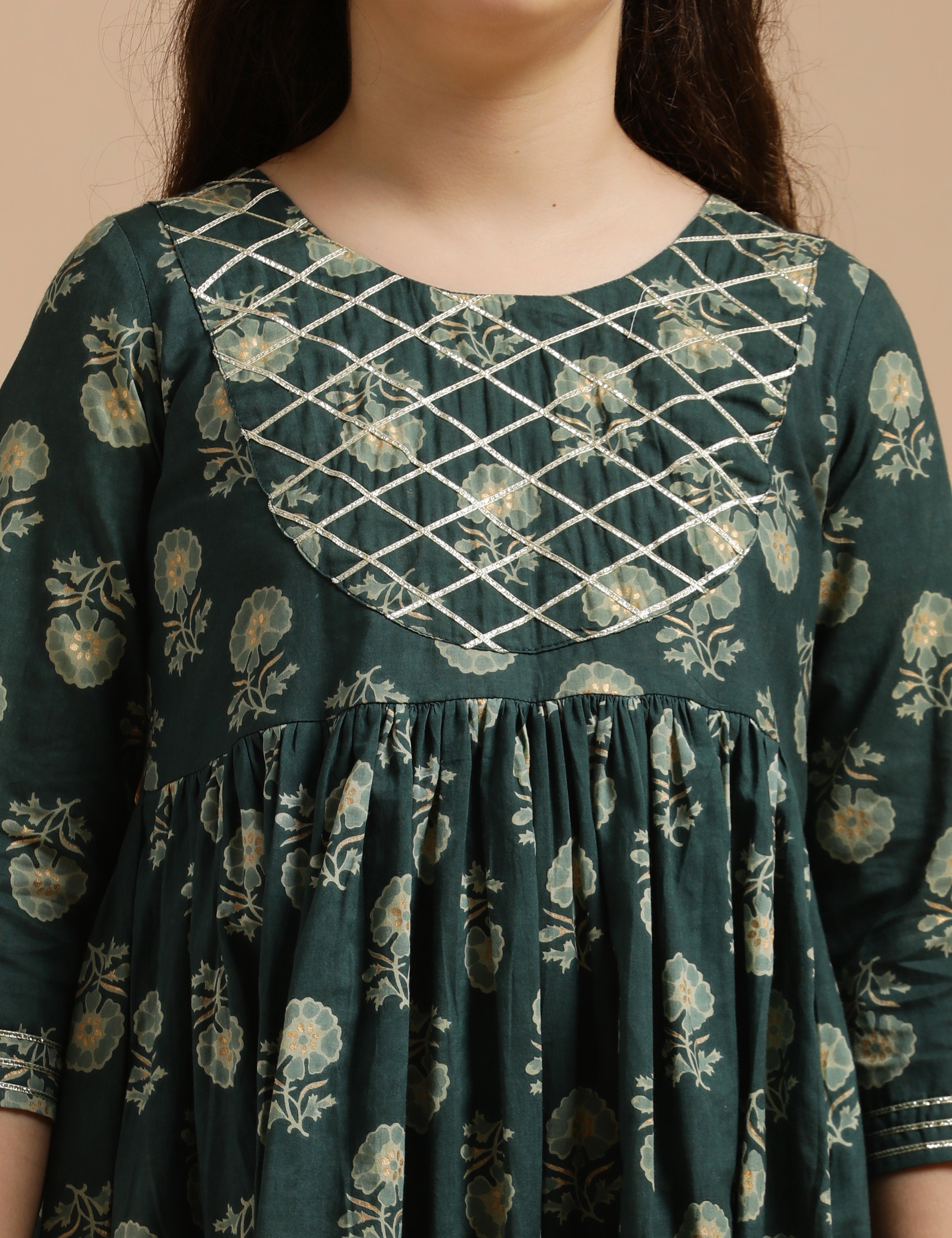 Embrace a comforting style with this Floral Embroidered Pure Cotton Green Kids Kurta Sets. This Anarkali Kurta For Kids Girls has a Round Neck, Three-Quarter Sleeves With Gotta Patti. Paired With a Sharara.