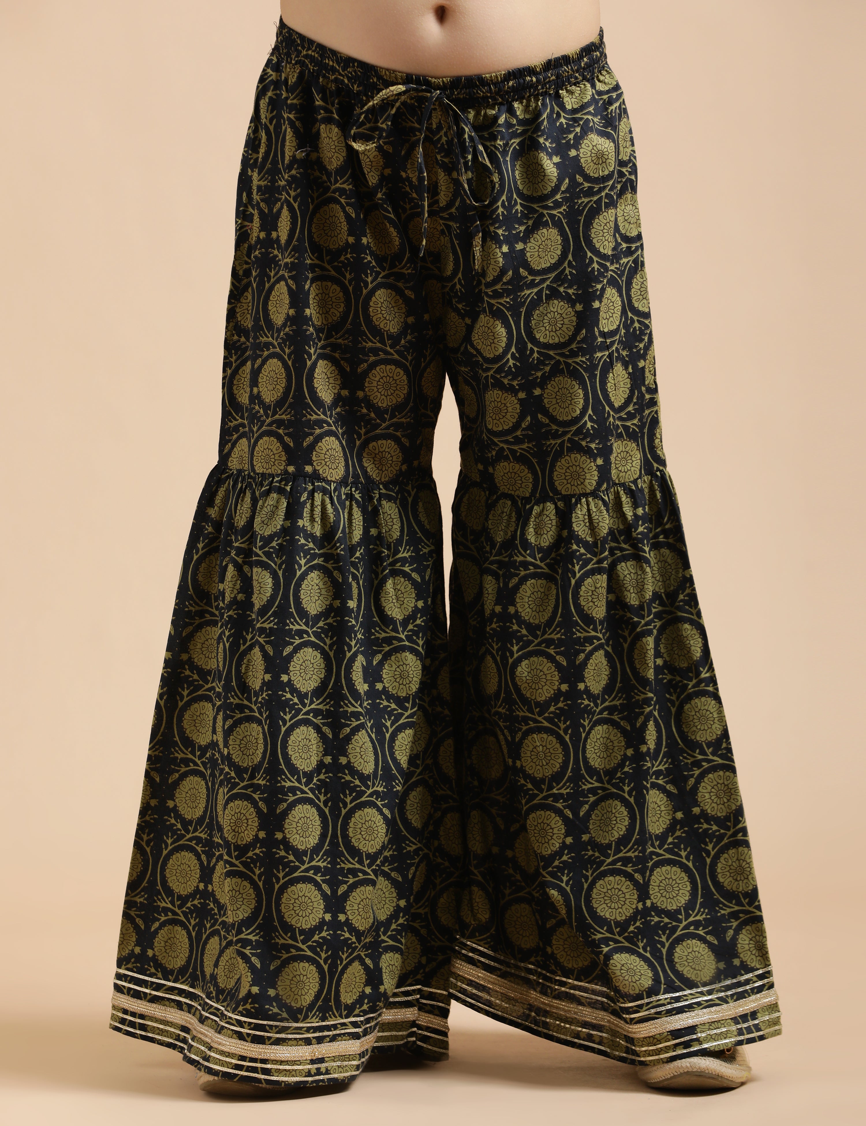 Embrace a comforting style with this Floral Embroidered Pure Cotton Black Kids Kurta Sets. This Anarkali Kurta For Kids Girls has a Round Neck, Three-Quarter Sleeves With Gotta Patti. Paired With a Sharara.