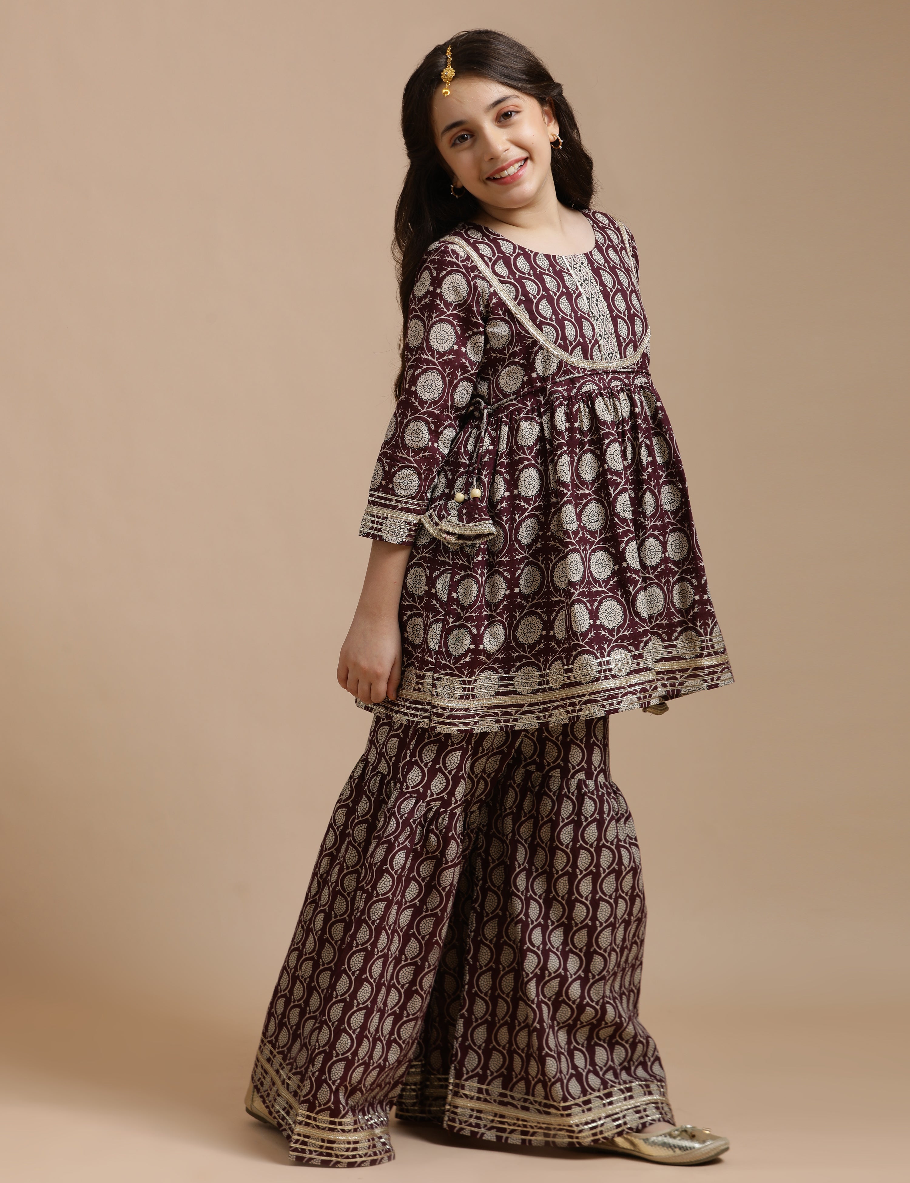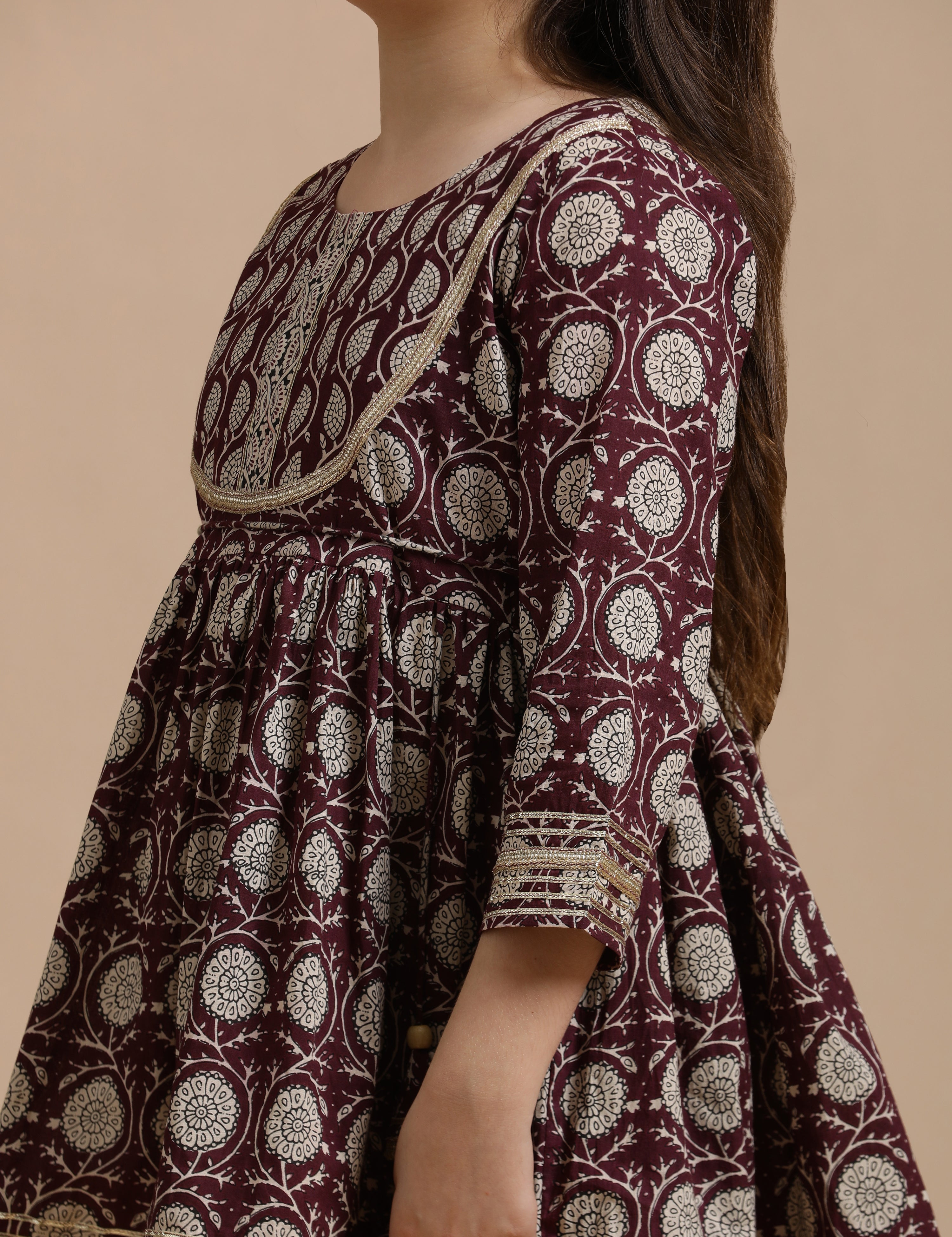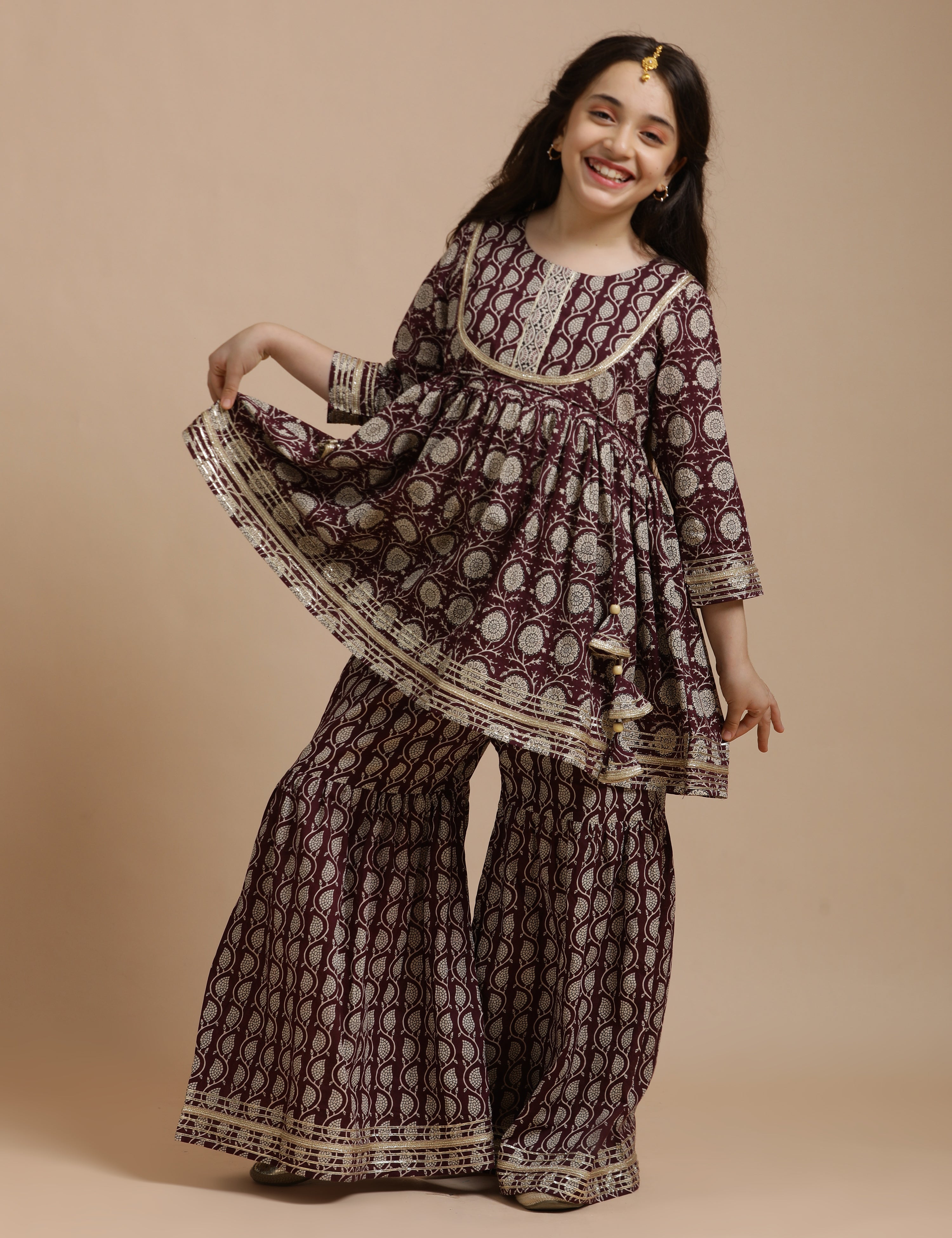 Embrace a comforting style with this Floral Embroidered Pure Cotton Wine Kids Kurta Sets. This Anarkali Kurta For Kids Girls has a Round Neck, Three-Quarter Sleeves With Gotta Patti. Paired With a Sharara.
