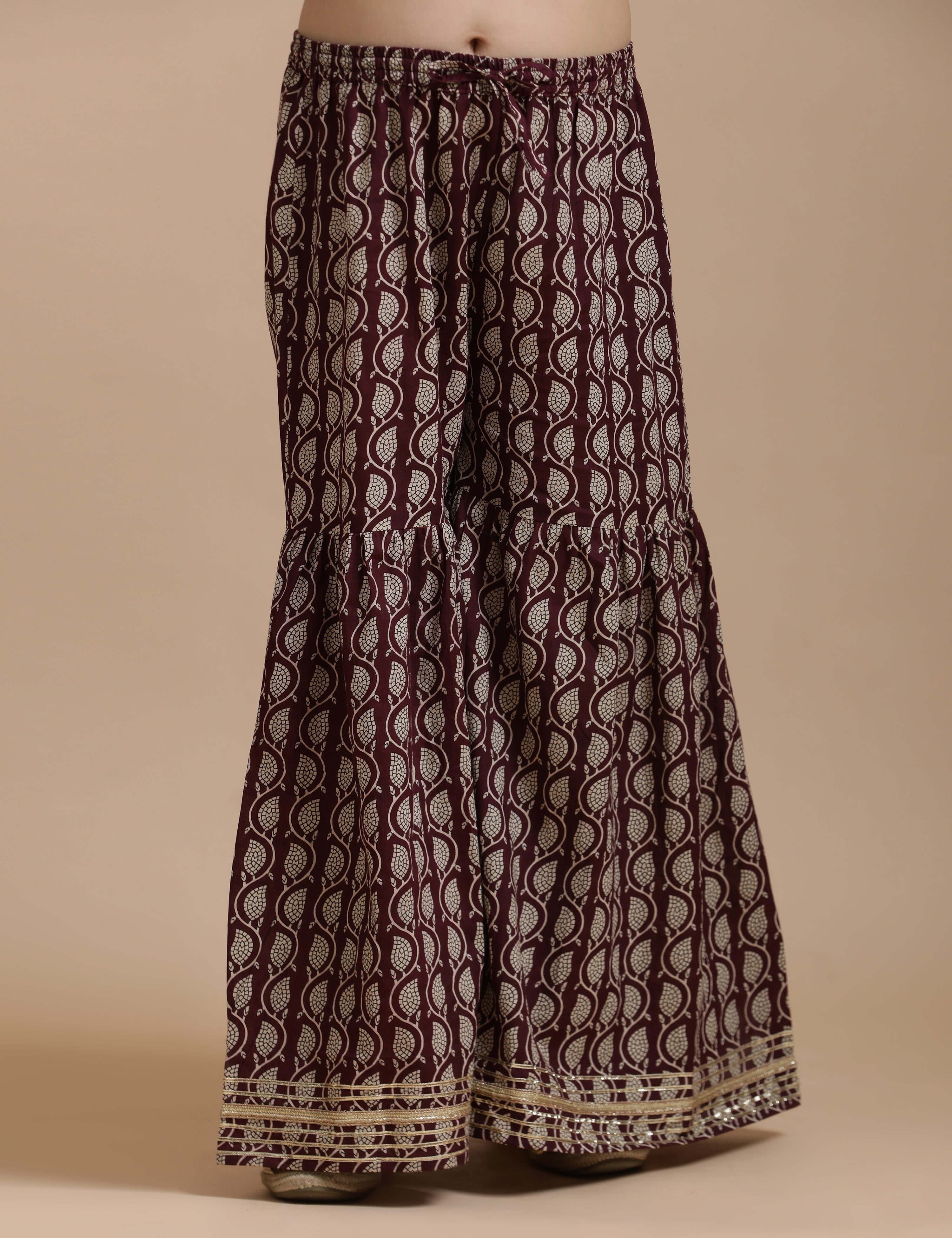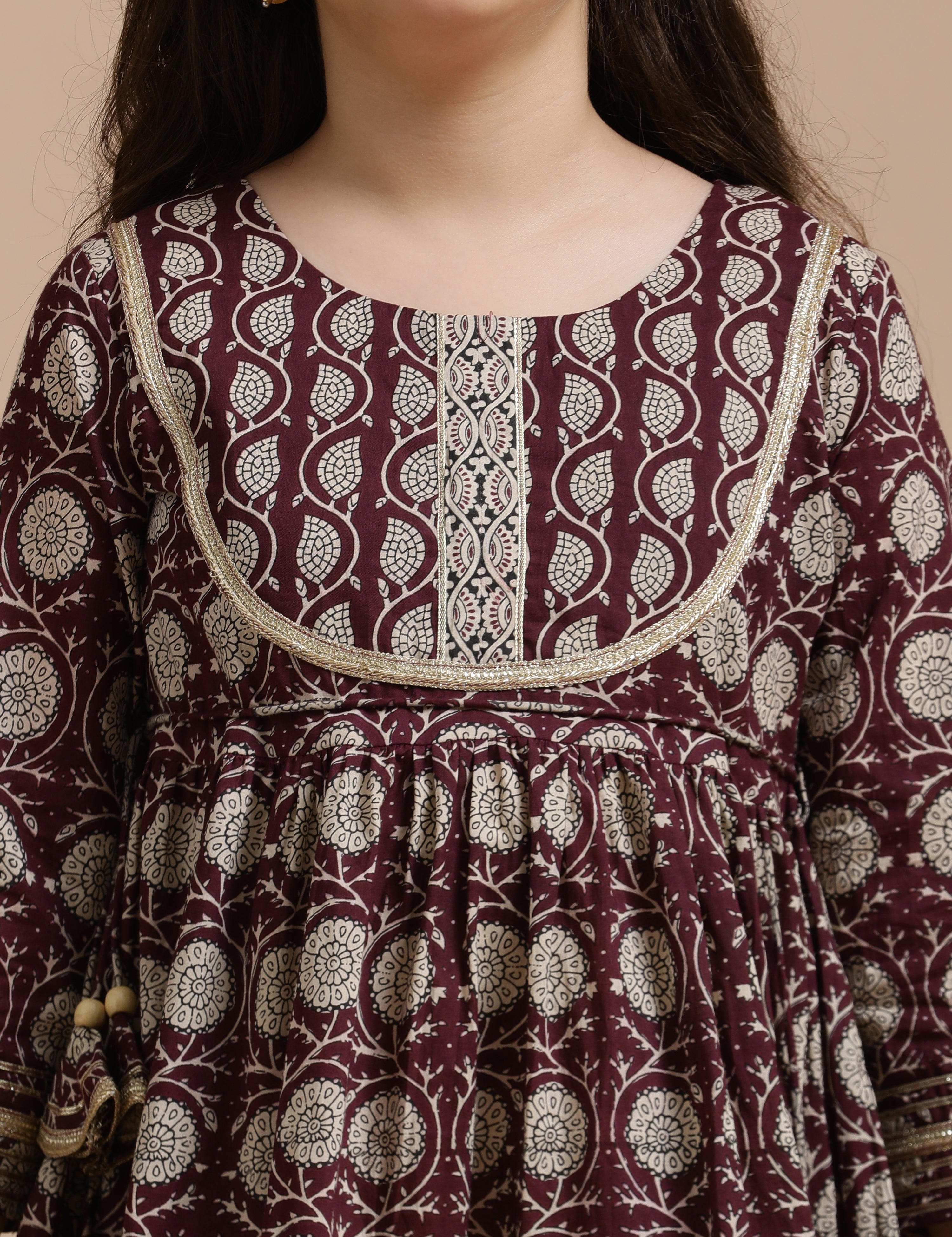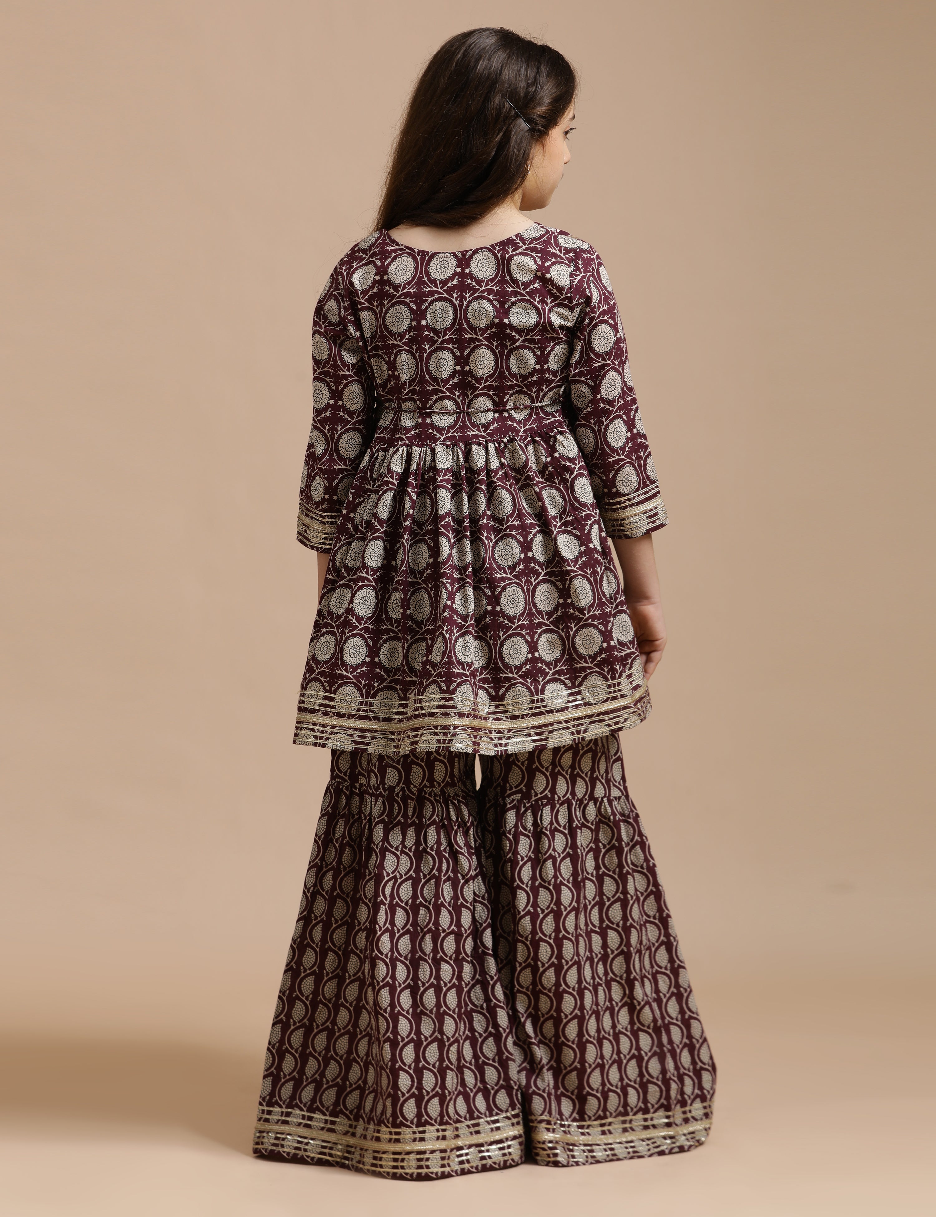 Embrace a comforting style with this Floral Embroidered Pure Cotton Wine Kids Kurta Sets. This Anarkali Kurta For Kids Girls has a Round Neck, Three-Quarter Sleeves With Gotta Patti. Paired With a Sharara.