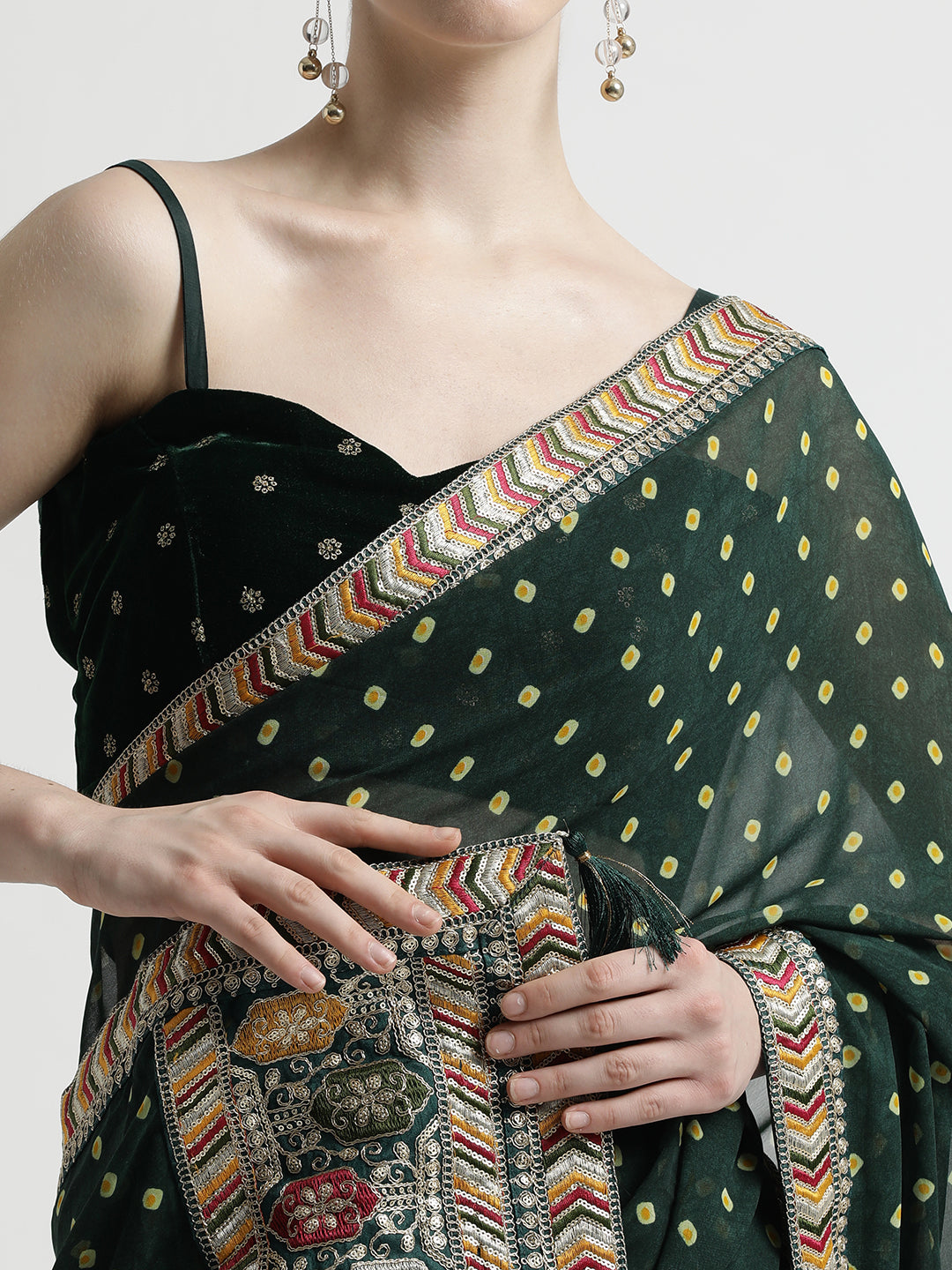 Embrace the traditional charm of Bandhani Embroidered Pure Georgette Saree. It has an embroidered border and heavy work on the palla.