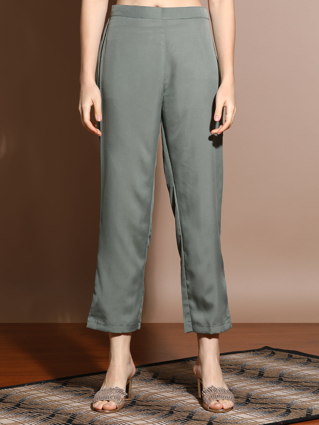 Add this glamorous Olive Chanderi Woven Festive Kurta Set With Dupatta to your wardrobe. The kurta has a v-neck with embroidery, three-quarter sleeves and straight hemline. It is paired with solid pants and a net dupatta with kiran lace.