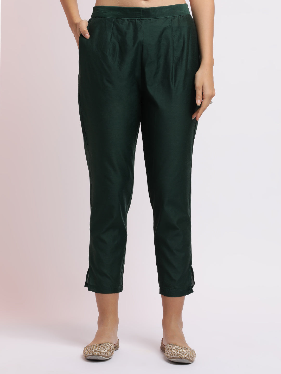 Carry glamour in this Green Embroidered Jacquard Kurta Set With Dupatta. The kurta has a round neck, heavily embroidered yoke and three-quarter sleeves. It is paired with solid trousers and a woven design dupatta.
